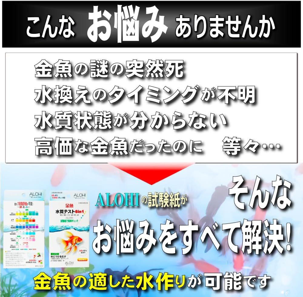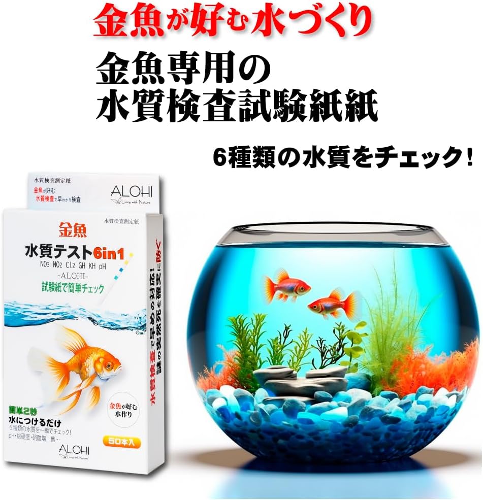 商品情報名称【ALOHI】金魚水質検査紙 6in1本数50本ブランドALOHI詳細情報・この試験紙は金魚専用に開発された初の水質検査キットです。金魚の水質検査が簡単に実施できます。金魚 水槽、金魚鉢、ビオトーブなどの飼育水における水質、総硬度 (GH) 硝酸塩 (NO3) 亜硝酸塩 (NO2) 塩素 (CL2) 炭酸塩硬度 (KH) PH (ペーハー)が1.2分程度で検査が可能です。・金魚 水槽や金魚の飼育水は、金魚の餌などが水槽底や金魚 砂利に蓄積されアンモニアを発生させそのアンモニアはバクテリアが分解し、亜硝酸から硝酸塩へと分解されていきます。この硝酸塩(NO3)が蓄積されると金魚 生体 に悪影響を与えます。・金魚 水槽 水質検査キットでの水質検査の方法は、飼育水に試験紙を2秒間浸したのち、リトマス紙や水槽 ph試験紙の様にカラーチャート見本の色合いと試験紙結果の色合いを見比べて頂き合致した色合いで判定して頂けます。・普段、金魚 フィルターなどでろ過されていると思いますが、この水質検査キットは従来の水質検査紙の製品とは違いカーラーチャート色見本が豊富で36種類揃えており更に詳しい水質チェックが可能で水質改善が期待できます。 この水質検査キットを使えば水換えの目安も簡単に分かりますので便利です。一度この水質検査紙をお試し下さい。ご注意・必ず使用方法を守ってください。 ・試験紙は2秒浸した後、水分をしっかり振り落としてください。 ・判定は30~60秒以内に行ってください。 ・判定は自然光や室内灯の下で行い、強い水槽蛍光灯での直下は避けてください。 ・湿気を避け、キャップをしっかり閉めて保管してください。[国内初の金魚専用試験紙] [長生きできる環境をサポート] [意外と金魚はシビアな管理が必要です] [検査は1分程度でできます] [中国由来の金魚にあった水質をサポート] [検出範囲が広く詳細な検査が可能] [この1枚の試験紙が未来に繋げます] 【ALOHI】金魚 水質検査 6in1 金魚 水質検査キット(50本) アクアリウム 水質検査 水槽 水質検査 金魚鉢 金魚 水槽 試験紙 硬度 硝酸塩 亜硝酸塩 炭酸塩硬度 塩素 PH リトマス試験紙 硝酸態窒素 金魚 検査キット 水槽 水質検査 水質検査紙金魚専用に開発された水質試験紙です。水換えタイムミングも分かります!商品情報名称【ALOHI】金魚水質検査紙 6in1本数50本ブランドALOHI詳細情報・この試験紙は金魚専用に開発された初の水質検査キットです。金魚の水質検査が簡単に実施できます。金魚 水槽、金魚鉢、ビオトーブなどの飼育水における水質、総硬度 (GH) 硝酸塩 (NO3) 亜硝酸塩 (NO2) 塩素 (CL2) 炭酸塩硬度 (KH) PH (ペーハー)が1.2分程度で検査が可能です。・金魚 水槽や金魚の飼育水は、金魚の餌などが水槽底や金魚 砂利に蓄積されアンモニアを発生させそのアンモニアはバクテリアが分解し、亜硝酸から硝酸塩へと分解されていきます。この硝酸塩(NO3)が蓄積されると金魚生体 に悪影響を与えます。・金魚 水槽 水質検査キットでの水質検査の方法は、飼育水に試験紙を2秒間浸したのち、リトマス紙や水槽 ph試験紙の様にカラーチャート見本の色合いと試験紙結果の色合いを見比べて頂き合致した色合いで判定して頂けます。・普段、金魚 フィルターなどでろ過されていると思いますが、この水質検査キットは従来の水質検査紙の製品とは違いカーラーチャート色見本が豊富で36種類揃えており更に詳しい水質チェックが可能で水質改善が期待できます。 この水質検査キットを使えば水換えの目安も簡単に分かりますので便利です。一度この水質検査紙をお試し下さい。ご注意・必ず使用方法を守ってください。 ・試験紙は2秒浸した後、水分をしっかり振り落としてください。 ・判定は30~60秒以内に行ってください。 ・判定は自然光や室内灯の下で行い、強い水槽蛍光灯での直下は避けてください。 ・湿気を避け、キャップをしっかり閉めて保管してください。