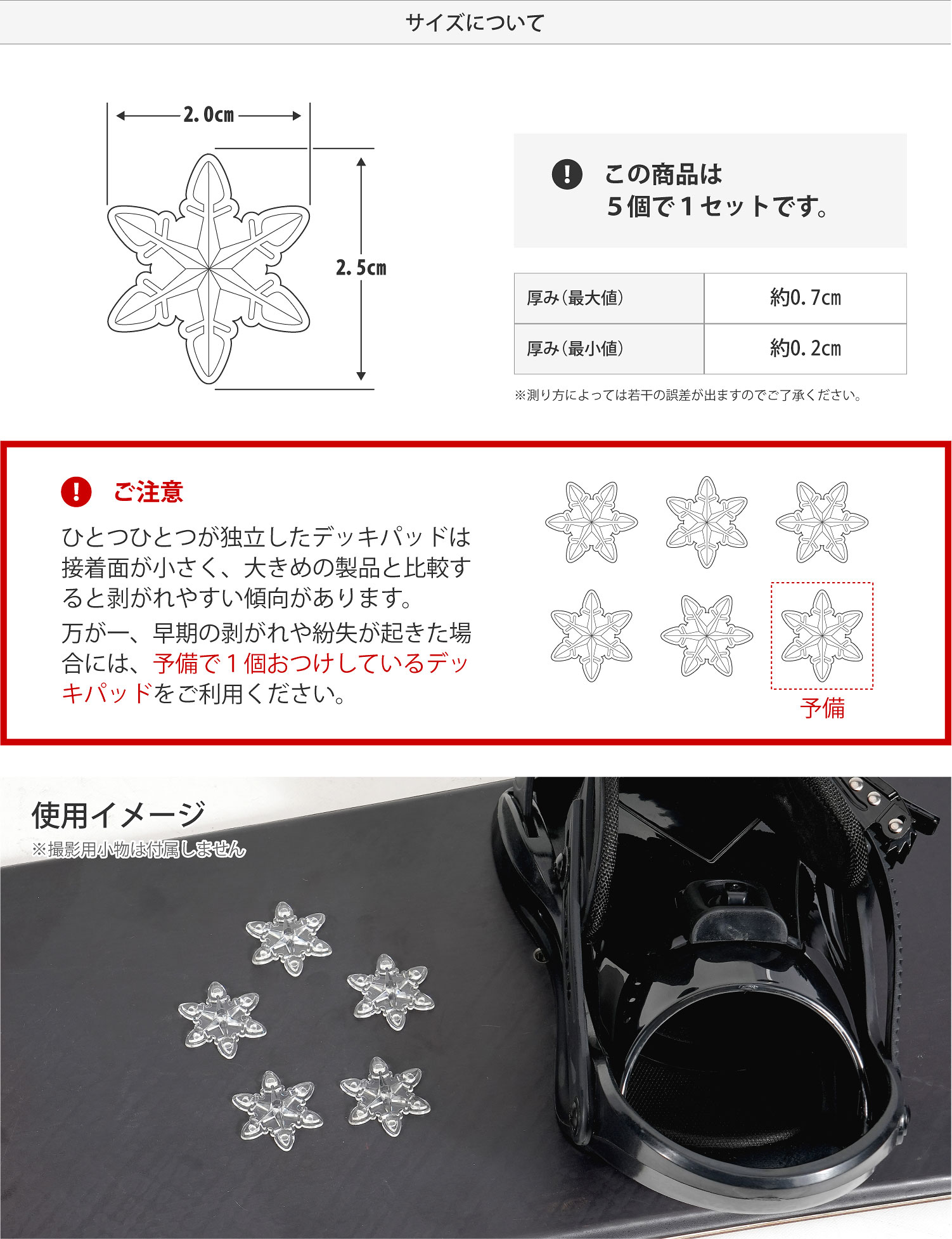 片足での スケーティング 時に便利な スノーボード用 デッキパッド スノーボードブーツのサイズに合わせて、サイズコントロールが可能な貼り付け位置を調節できるタイプ。 足を乗せる位置に貼ることで滑り止めとなり、スケーティングがしやすくなります。 【ブランド】VAXPOT(バックスポット) 【型番】VA-2813 【特徴】 ・5個で1セット ・自分だけのセッティングが可能なセパレートタイプ ・ブーツサイズに合わせて貼り付け位置を調節 ・ボードのグラフィックを邪魔しにくいクリアカラー 【説明】 ブーツサイズにあわせて貼り付け位置を調節できるスノーボード用デッキパッド(5個で1セット)。 それぞれ自由な位置に貼れるので使用者のブーツに合わせたセッティングが可能。 雪の結晶ひとつひとつが複雑な形状の凹凸で、グリップ力を発揮します。 透明度が高くスノーボードのグラフィックを邪魔しません。 【取付時の注意】 ボード表面をキレイに拭き、気温15度以上の場所で装着してください。 【特記事項】 本品は5個で1組の商品です。 使用に伴う紛失等の予備として【+1個】おつけしています。 最初から全部を貼るのではなく、予備として保管しておいてください。 ※デッキパッドは消耗品のため、剥がれや紛失等での返品交換はお受けしておりません。