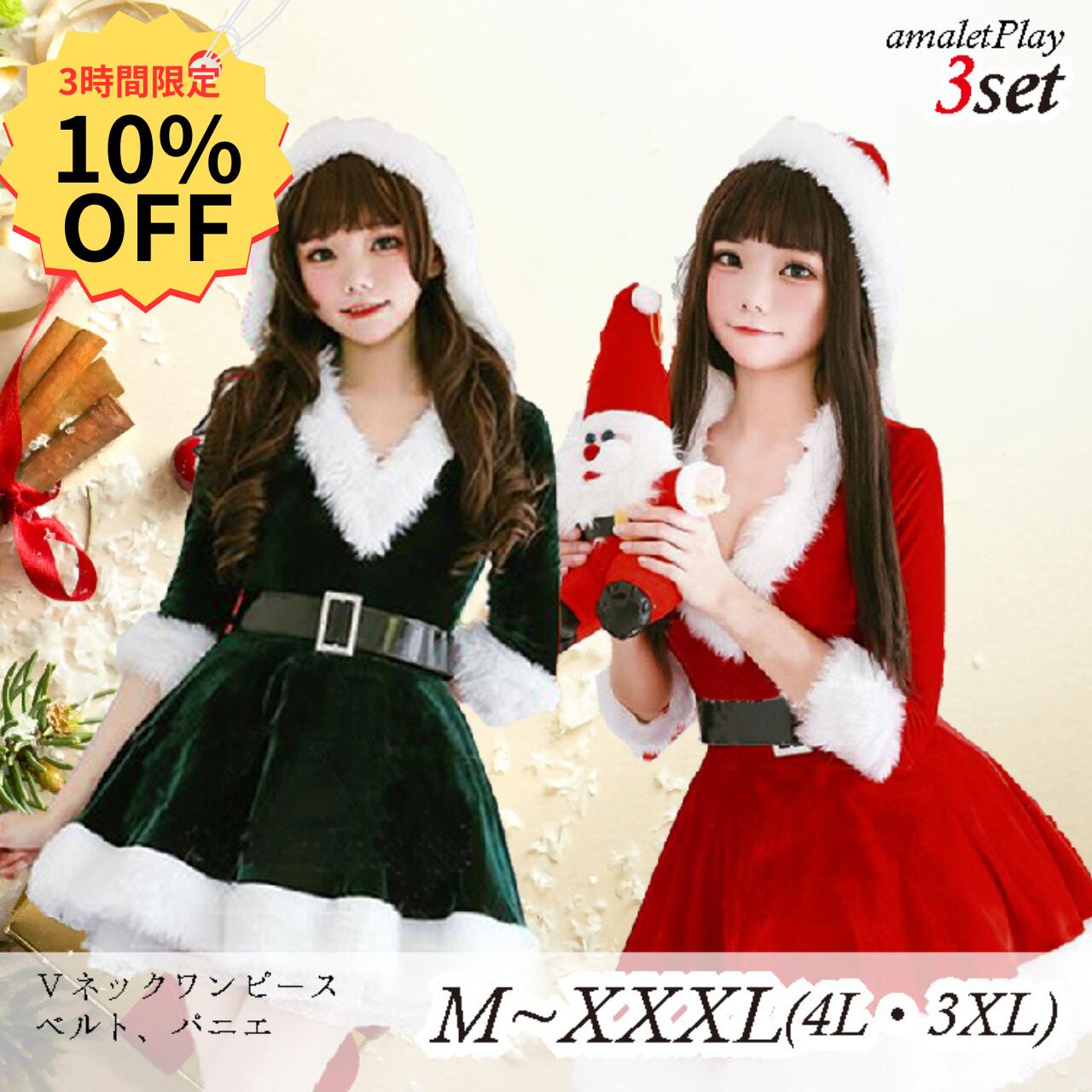 \一部入荷中/Vネック サンタ コスプレ パニエ 付 ふわふわ ファー クリスマス 大きい サイズ アメリカンサイズ M〜XXL 3L XXXL 4L 大人 レディース 女装 パーティ イベント