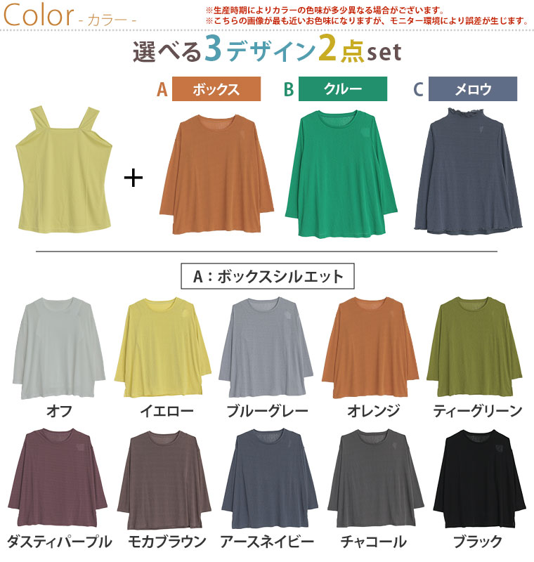 ★リアルタイム★売り上げ実況中! インフォメーション ご 注 意 ■商品は再生産時、多少色に濃淡が出ます。同色商品を再購入頂きます際には、そのことをご了承頂きます様、宜しくお願致します。 ■商品の袋を開けた際、 袋の中にこもっていた染料のニオイがする場合がございます。 身体に害のあるものではありませんので、ご安心下さいませ。 お手数お掛け致しますが、 気になる方は風通しの良い場所での日陰干しをお勧めしております。 それでも気になる場合は、こちらの方法をお試しください。 ■サイズは実寸で表記しております。パンツ、ボトムの場合ウエストは実際の商品のウエスト寸法を記載しており、商品によって股上寸法が違いますので、お手持ちの商品と比較してサイズを確認お願い致します。 ■画像はお使いのパソコンやモニターにより色が変わることがあります。ご了承下さいませ。また、屋外での撮影の場合、多少実際のカラーと異なる場合がございます。 ■本製品は生産過程におきまして、生地を織る際の糸の継ぎ目や多少のほつれが生じることがありまが、品質上は問題ありません。 また、生地の織りに他繊維が混紡している場合もございます。 ■洗濯につきましては、お色物は色落ちの可能性がございますので単品洗いでお願い致します。インポートものの為、裏側等見えない部分に若干縫製の粗い部分がある場合もございますが、着用には全く差し支えございません。 同じお色でも染めの関係で、若干お色が異なってくる場合がございます。予めご了承くださいませ。 ■海外縫製商品の場合、サイズタグの表記違いが有る場合がございます。その場合極たまにペン等で手書き修正して有る場合がございますが、商品自体には、問題はございませんので何卒ご了承下さいませ。 ■送料無料商品の配送について 送料無料商品のお届けにつきましては、当店指定の配送方法にて発送の手配をさせて頂きます。 ご指定頂いておりません配送方法にて商品のお届けがされる場合もございますので、 あらかじめご了承下さいませ。 メール便について ■商品名に【メール便可1】と記載のある商品は、基本的に1点までメール便対応が可能となります。 ※その他【メール便可2】、【メール便可3】等の記載がある場合は同数字の商品数までメール便対応可能です。 【メール便可1】の商品を、2点以上ご注文を頂きました際は、宅配便へ変更のうえ配送を手配させて頂きます。また、お買い物かごを分けてご注文頂きました際にも、発送日前日5時までの注文につきましては、システム上、自動的に「同梱」がかかるようになっております。 同梱をせず、複数個口でのメール便発送をご希望の際は、備考欄へ【同梱不可】とご記載頂ければ、メール便での個別発送をさせて頂きます。何卒よろしくお願い致します。 商品名 丁度良い透け感 選べる3シルエット 欲しかった 透けすぎない シアー トップス & タンク アンサンブル サイズ Lサイズ LLサイズ 3Lサイズ 4Lサイズ 5Lサイズ 6Lサイズ 7Lサイズ 8Lサイズ 11号サイズ 13号サイズ 15号サイズ 17号サイズ 19号サイズ 21号サイズ 23号サイズ 25号サイズ 年代 10代 20代 30代 40代 50代 60代以上。 丈 長袖 取扱い商品 春 夏 秋 冬 トップス タンクトップ アンサンブル 2点セット ハッピーマリリン マリリン a happy marilyn あはっぴーまりりん ハピマリ 大きいサイズマリリン 大きいサイズ おおきいさいず おおきなサイズ 大きめ プラスサイズ ぽっちゃり ぽっちゃり服 ラージサイズ ビッグサイズ オーバーサイズ ゆったりサイズ LLサイズ 3Lサイズ 4Lサイズ 5Lサイズ 6Lサイズ 7Lサイズ 8Lサイズ 9Lサイズ 10Lサイズ XL XXL XXXL 2XL 3XL 4XL 11号 13号 15号 17号 19号 低身長 小柄 高身長 大柄 背が高い 背が低い レディース レディースファッション 婦人服 婦人用 女性用 女性服 ladies fashion 20代 30代 40代 50代 60代 アラサー アラフォー アラカン オトナ 大人 大人女子 ママ ママファッション エイジレス ノンエイジ 楽天スーパーセール super sale 楽天お買い物マラソン お買い物マラソン オフィス オフィスカジュアル 通勤 通学 デイリー 会社 職場 仕事着 仕事服 公園 お買い物 ショッピング デート おでかけ お出掛け リラックス 旅行 おしゃれ お洒落 オシャレ 可愛い かわいい カワイイ cawaii 大人可愛い カッコイイ 格好いい カジュアル フェミニン ガーリー 体型カバー スタイルアップ 着痩せ 着やせ 細見え すっきり見え 旬 トレンド 通販 オンラインストア ネットショッピング 着回し力 コーディネイト 新作 NEW 新登場 春 春物 春服 spring 夏 夏物 夏服 summer 秋 秋服 秋物 autumn 冬 冬服 冬物 winter オールシーズン 通年 【500051(Aタイプ)/500052(Bタイプ)/500053(Cタイプ)/Aタイプ/ブラック、Aタイプ/オフ、Aタイプ/モカブラウン、Aタイプ/ティーグリーン、Aタイプ/ダスティパープル、Aタイプ/アースネイビー、Aタイプ/オレンジ、Aタイプ/イエロー、Aタイプ/ブルーグレー、Aタイプ/チャコール、Bタイプ/ブラック、Bタ