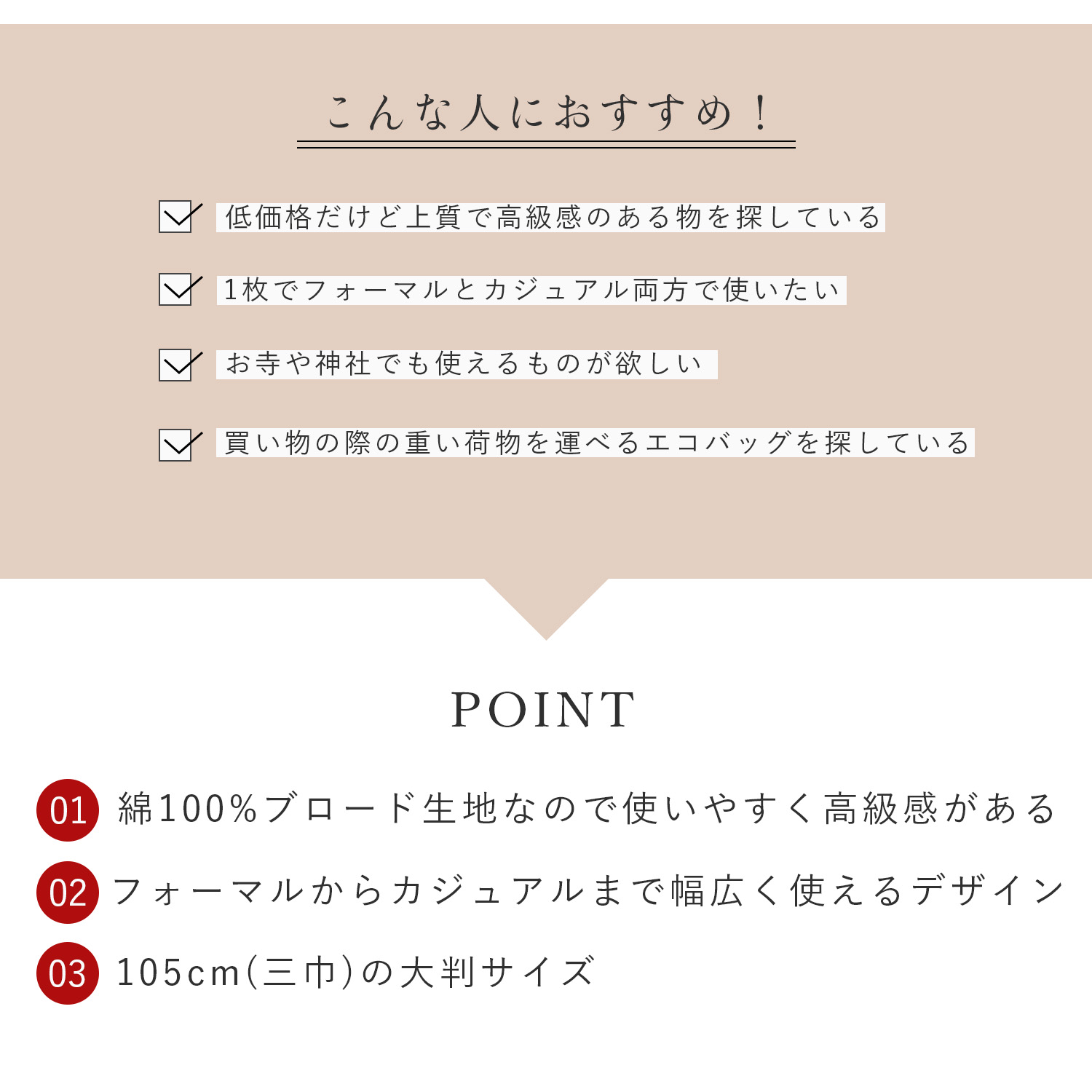 慶弔から普段使いまで幅広く大活躍!綿100%ブロード無地紺ふろしき 【綿100%ブロード生地】 薄手なので軽量でさらにしっかりとした生地になっています。 耐久性があり、くり返し使ってもヘタれません。 また、適度な光沢感と艶があるので上品さや高級感があるのが特徴です。 【フォーマルからカジュアルまで幅広く使える】 無地の紺色の風呂敷は慶弔両方でお使いいただけます。 贈り物を包んだり、ご家庭で使用したりなど大活躍するデザインとなっております。 【約105cmの大判サイズ】 日常的に使いやすい大判サイズです。 着付け小物などの小物をまとめる、お買い物時のエコバッグとして使う、 衣類を包んで収納するなど、用途は様々です。 折り畳んでコンパクトに収納し、カバンに入れて簡単に持ち運びも♪ 【様々なサイズをご用意しております♪】 ●四巾(126cm)はコチラから購入できます。 ●五巾(175cm)はコチラから購入できます。 ●六巾(200cm)はコチラから購入できます。 【サイズ】約105×105cm 【素材】綿100% 【製造】日本製 【注意事項】 ・上下の2辺はほつれ防止の為、生地端をミシン縫製。左右はヒートカット(熱処理)を施してある反物のミミを生かした仕様となっております。織り工程の時点でほつれにくく処理されていますのでご安心ください。 ・サイズはおおよその幅になります。 ・表示されている画像の色はできるだけ実際の商品に近づけるよう努力をしていますが、お使いのモニター環境によって差異が生じます。 ・PP袋に折りたたんでお届けしますが、シワになってる場合があります。 ・シワが付きやすい生地となっております。ご使用後や洗濯後にシワが気になる際はアイロン等でシワを伸ばしてからご使用または収納ください。綿ブロードふろしき ラインナップ