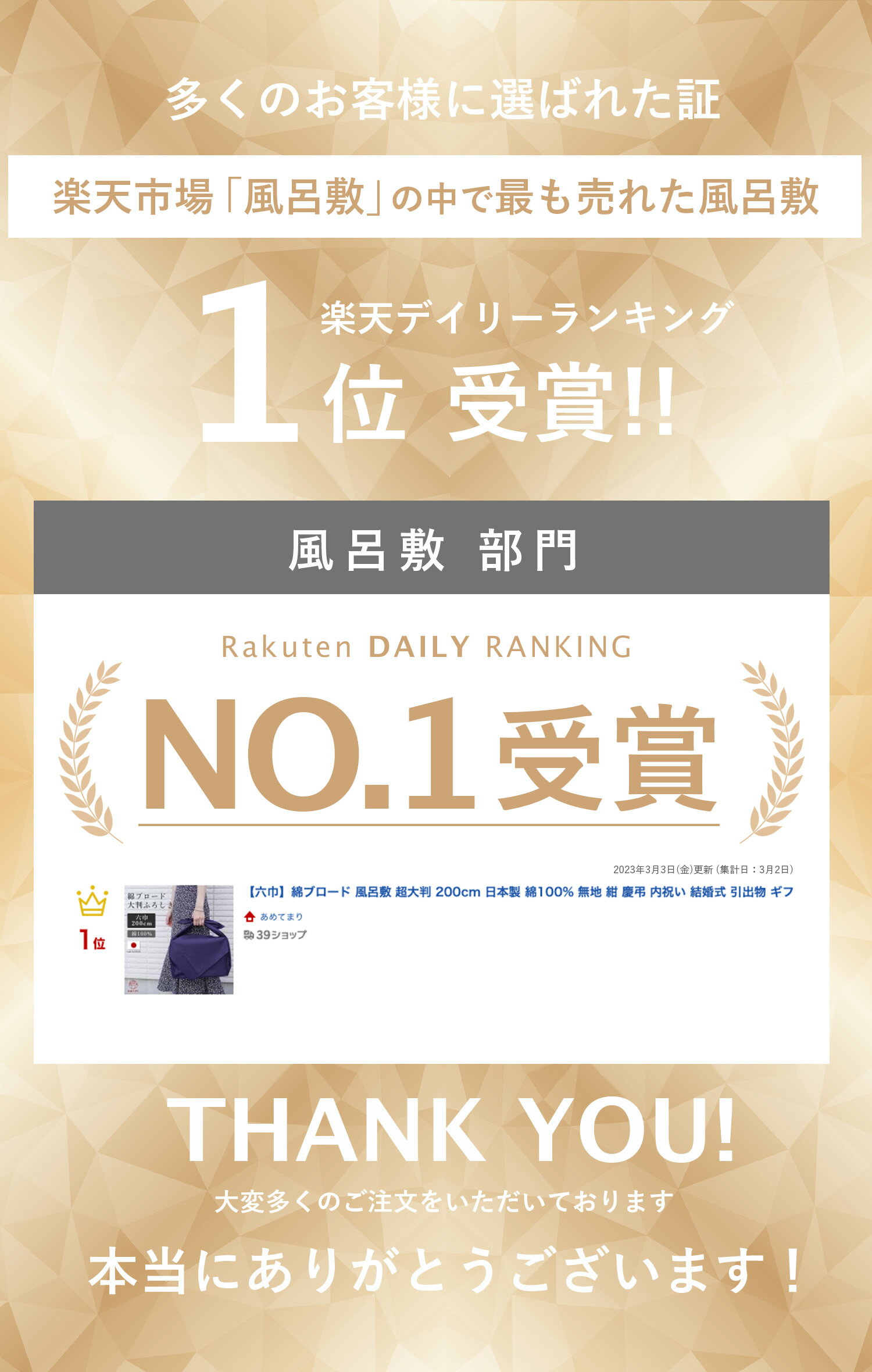慶弔から普段使いまで幅広く大活躍!綿100%ブロード無地紺ふろしき 【綿100%ブロード生地】 薄手なので軽量でさらにしっかりとした生地になっています。 耐久性があり、くり返し使ってもヘタれません。 また、適度な光沢感と艶があるので上品さや高級感があるのが特徴です。 【フォーマルからカジュアルまで幅広く使える】 無地の紺色の風呂敷は慶弔両方でお使いいただけます。 贈り物を包んだり、ご家庭で使用したりなど大活躍するデザインとなっております。 【約200cmの大判サイズ】 男性用の着物や袴をまとめるのにお使いいただいたり、シーズンの終わった 布団を収納するために包んだりと嵩張るものや大きいものを包む際に 大活躍のサイズです。また、習い事やお稽古の道具や荷物、弓道着や柔道着 などさまざまな物を包んで運ぶことができます。 【様々なサイズをご用意しております♪】 ●三巾(105cm)はコチラから購入できます。 ●四巾(126cm)はコチラから購入できます。 ●五巾(175cm)はコチラから購入できます。 【サイズ】約200×200cm 【素材】綿100% 【製造】日本製 【注意事項】 ・上下の2辺はほつれ防止の為、生地端をミシン縫製。左右はヒートカット(熱処理)を施してある反物のミミを生かした仕様となっております。織り工程の時点でほつれにくく処理されていますのでご安心ください。 ・サイズはおおよその幅になります。 ・表示されている画像の色はできるだけ実際の商品に近づけるよう努力をしていますが、お使いのモニター環境によって差異が生じます。 ・PP袋に折りたたんでお届けしますが、シワになってる場合があります。 ・シワが付きやすい生地となっております。ご使用後や洗濯後にシワが気になる際はアイロン等でシワを伸ばしてからご使用または収納ください。