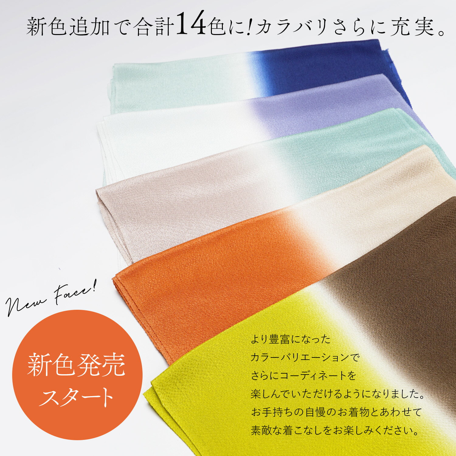 \あめてまりオリジナル・日本製・高級感あふれる帯揚げ/ \\\♪全14色から選んでいただけるようになりました♪/// 常に売れてる当店大人気商品《2色ぼかし 帯揚げ》に新色が仲間入です♪ シルク100%のちりめん生地の染め分け帯揚げ。 オールシーズン使え、フォーマルからカジュアルまで幅広く使える当店の帯揚げは1枚あると重宝します。 初心者からプロの皆さんの声を当店が独自に集計し、 「使える!欲しい!」と思うベストな配色を選定! 1本で2色楽しめ、5通りのコーディネートが楽しめる帯揚げ。 帯やお着物のお色に合わせて、その日の気分に合わせて、など♪ 様々なコーディネートをお楽しみください! 【こだわりポイント!】 1. 高品質なシルク100% 正絹だから出せる上品で美しい光沢 高級感のあるオシャレな着物姿に仕上がります。 2. 1枚で5通り使える 着物や帯、その日の気分に合わせて5通りのバリエーションが楽しめます♪ お色の選び方の例として、お召になる着物または帯に使われている1色に合わせると良いとされています。 3. 1枚1枚手作業で仕上げた優美な色合い 繊細で上品な色合いは職人が手作業で染め上げるからこそ出せる技です。 はんなりと淡く柔らかなお色、コーディネートをビシッと締めるシックな濃いお色、 上品な華やかさのある明るいお色、当店がこだわりを持って配色しました。 欲しい色が必ず見つかる全14色 01. 若草色×テラコッタ 02. 萌木色×クリームイエロー 03. みそら色×クリームイエロー 04. 薄墨色×ミッドナイト 05. 桃紅色×アクアブルー 06. 紅梅色×スイーティーグレー 07. 鳥の子色×ココアブラウン 08. 京紫色×アンティークゴールド 09. 孔雀青×レディッシュゴールド 10.カナリア×カカオ NEW 11.柿杏×亜麻色パール NEW 12.ブルーグリーン×トープ NEW 13.リンドウ×月白 NEW 14.瑠璃色×うずしお NEW 【サイズ】 長さ:約178cm 巾:約30cm 【素材】 綿100% 引き染めぼかし 【製造】日本製 【注意事項】 ※表示されている画像の色はできるだけ実際の商品に近づけるよう努力をしていますが、お使いのモニター環境によって差異が生じます。 ※サイズはおおよその幅になります。 ※一枚一枚手作業でお作りしているので色ムラやシミ、ほつれがある場合がございます。 仕様となっておりますので、予めご了承の上ご購入ください。 ※ミミは若干波打っていたり、ほつれがある場合がございますが、商品仕様となっております。 ※メール便での郵送となりますので、折ジワが付いている場合があります。 使用前にアイロン等でシワを伸ばしてからご使用ください。 ※製造時期により、若干色やサイズが変更になることがございます。<【あめてまりオリジナル】大人気帯揚げ帯締めセット> はコチラ