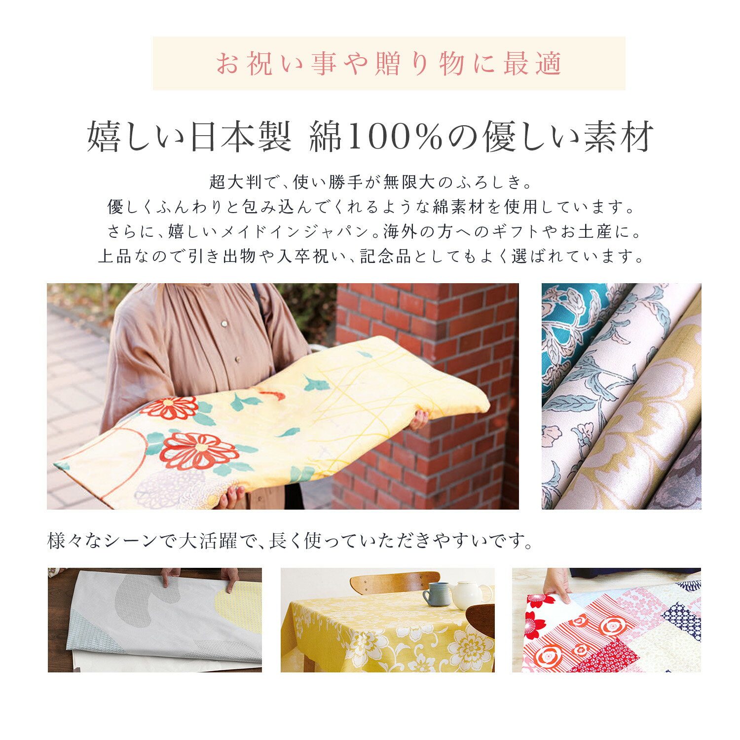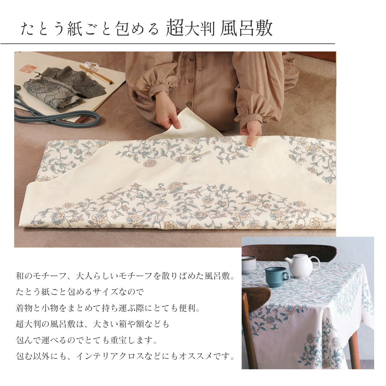 「むす美」たとう紙も包める、超大判つつみ風呂敷です。 たとう紙ごと包めるサイズなので着物と小物を まとめて持ち運ぶ際にとても便利。 大判の風呂敷は、大きい箱や額なども包んで 運べるのでとても重宝します。 包む以外にもインテリアクロスなどにもオススメです。 パッと広げてキュっと包める風呂敷は 近年エコバッグとしても、とても注目されています。 風呂敷は袋よりもコンパクトに収まるので、重宝します。 ご自分用、プレゼント用など様々なシーンでご活用ください。 【百貨つつみ】 様々な道具(百貨)をつつみ、インテリアとして 置いていてもかっこいい、シックなシリーズ。 男性にも人気の色調です。 【きもの包み】 生地がしっかりしていて大事な着物も安心です。 パール加工を施してあり光沢のある上品なデザインです。 テーブルクロスなどのインテリアとしてもおすすめ♪ 【晴れ着つつみ】 明るく、華やかさのあるデザイン。 ハレの日にぜひ使っていただきたい色柄で 贈り物としてもおすすめです。 【バリエーション】 七福神 チャコール (百貨つつみ) 七福神 ライトグレー (百貨つつみ) 花唐草 グレー (きもの包み) 花唐草 セイジ (きもの包み) 花唐草 カラシ (きもの包み) 花鳥更紗 キナリ (きもの包み) 花鳥更紗 アオミドリ (きもの包み) 梅 ピンク (晴れ着つつみ) 花づくし アカ (晴れ着つつみ) 菊 イエロー (晴れ着つつみ) 【使用例】 振り袖や着物を包む、大きな箱や額を包んで運ぶ、 エコバッグやお出かけ用のカバン、 旅行のサブバッグ、インテリアなど。 【サイズ】約145cm×145cm 【素 材】綿100% 【製 造】日本製 ※OPP袋にいれた状態でお送りさせていただきます。 ※箱には入っておりませんので予めご了承くださいませ。 ※「きもの包み 花唐草」にはパール加工を施しているので、 光沢があります。 【注意事項】 ※染色の特性上、摩擦や水濡れにより色落ち・色移りすることがあります。 ※箱には入っておりません ※商品には裏表があり、表のみの色柄になります。 ※ビニール袋での包装方法は選べませんのでご了承ください。写真は一例です。 ※衛生上、商品開封後の返品・交換は出来ません。予めご了承ください。 ※表示されている画像の色はできるだけ実際の商品に近づけるよう努力をしていますが、 お使いのモニター環境によって差異が生じます。 ※サイズはおおよその値となります。 ※本商品は箱無しになります。 ※両面染の特性上、多少の色ブレがございます。 ※柄の出方は1枚1枚異なります。 ※数量「2」以上は宅急便を選択くださいませ。 数量2以上ご注文で宅急便をご選択されていない場合はご注文を自動的にキャンセルさせていただきます。 ※入荷時期により約150cmサイズになる場合がございます。