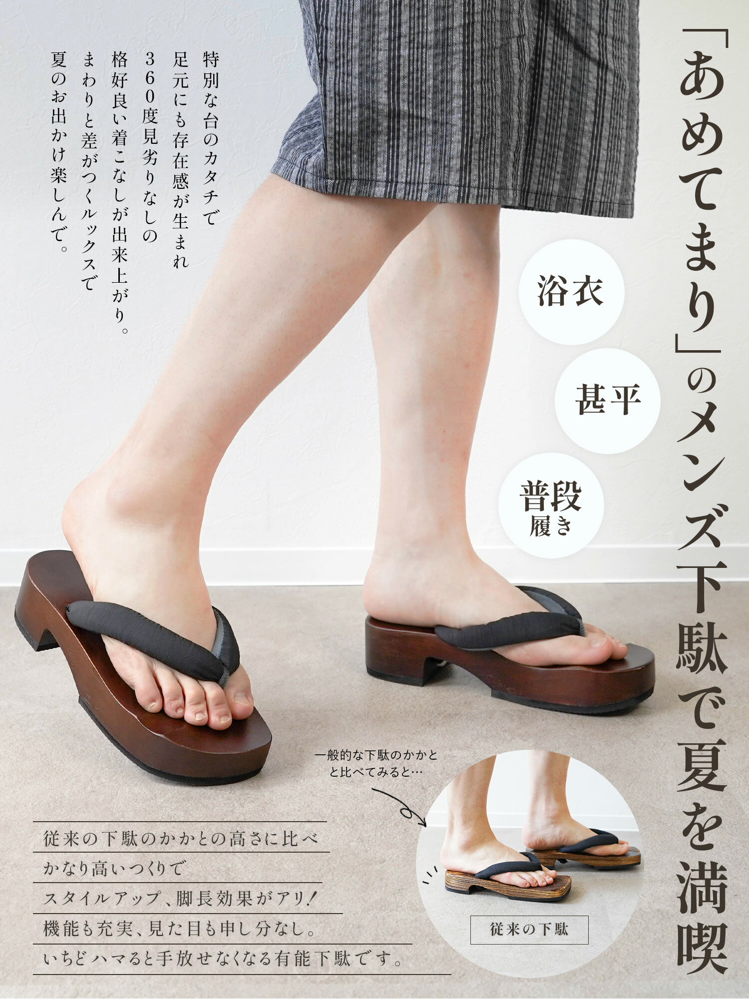 メンズの夏和装アイテムはコチラから! 浴衣や夏着物・和装アイテム大集合! \「あめてまり」メンズ下駄で夏を満喫/ 特別な台のカタチで足元に存在感! 従来の下駄のかかとの高さに比べかなり高いつくりでスタイルアップ、脚長効果がアリ! 機能も充実、見た目も申し分なし。 長くご愛用していただけること間違いなしのいちどハマると手放せなくなる有能下駄。 360度見劣りなしの格好良い着こなしが出来上がります! まわりと差がつくルックスで夏のお出かけ楽しんで。 【台のカタチは特別な「アーチフィット」】 長時間履き続けてもらくらく、歩きやすさをとことん追及しました。 茶塗りと焼き桐、選べる2タイプの塗りで、 どちらを選んでいただいても足あたりよく 台のくぼみが足裏にフィットする形状が特徴です。 通常の下駄よりヒールの高さがあるので、 立ち姿・着姿は凛々しく、格好良く、スタイルアップも叶います。 鼻緒は見た目涼しげでシャリ感がある、流行りのスポーツテック風。 ふんわり優しくフィットする太鼻緒です。 いろいろな世代どなたでも喜んでいただけ、夏のギフトにも重宝。 ぜひお手元にとり、履き心地を体感ください。 足裏が下駄表面(アーチ部分)にぴったりフィット。 この感覚、密着感は未経験の快適さ。 「長時間履いても疲れない!」「もう従来の下駄には戻れません!」と好評のお声をいただいています。 まさに見た目も機能性も、両方満足の下駄です。 それもそのはず。 このメンズ下駄、小さなこだわりが至るトコロにつまってます。 機能性や履き心地、そしてフォルムの美しさを追求しました。 従来の下駄とはあきらかに違うディテールに注目してください。 鼻緒は肌触り良く太めで幅広、生地は流行りのスポーツテック風です。 夏祭りや街歩きなど、夏のイベントでは下駄の長時間履きが常。そこで、鼻緒は足にやさしくフィットする太鼻緒に。 男性特有のお悩みである皮脂の吸収、ムレにくさに重点をおきました。 幅広太鼻緒は、柔らかく足に優しく、たくさん歩いても、指が擦れにくく安心でおでかけしていただけます。 本格天然素材の台で、 マットな風合いつや消し「茶塗り」と 木目が美しい「焼き桐」の2種類をご用意。 両方とも日本の夏にふさわしい趣、素材の上質さを際立たせる職人技の塗りです。 桐は水や湿気に強く、防カビ・防虫効果にすぐれています。 底はゴム素材のEVAソール採用。 滑りにくく、そして疲れない。雨天にも強い仕上がりで、下駄を履き慣れない方でも比較的ラクに履いていただけます。 定番の「浴衣」「甚平」「作務衣」などにはもちろん、デニムなどに合わせて「普段履き」にも。 サンダル感覚でサラッとつっかけていただくのもカッコいい。 まさにコーディネートは無限大。 シックなデザインですので、どんな年齢層の方にもぴったりです。 色違いで揃えたり、夏のギフト、海外の方へのプレゼントにも喜ばれますヨ。 「あめてまり」のメンズ下駄で、夏を満喫してくださいね♪ \大河ドラマ「べらぼう」でおなじみ!メンズ和柄巾着をおでかけのお供に♪/ 【選べる4タイプ】 天然桐素材の「茶塗り」と「焼き桐」の台をベースに4つのバリエーションをご用意しました。 「あめてまり」がこだわって配色をしたオリジナルカラーです。 どんなお召し物にもコーディネートしやすく夏のイベントや街歩きに大活躍。 A.グレー(茶塗り台) B.ブラック(茶塗り台) C.カーキ(焼き桐台) D.ネイビー(焼き桐台) 【サイズ】 〈Fサイズ〉 全長: 約28.0cm つま先〜前坪: 約5.0cm 前坪〜かかと: 約22.0cm かかとの高さ: 約5.0cm 横幅: 約10.0cm ※サイズはおおよそです。 適応サイズ:25.0cm〜27.5cm前後 ※大きめの足サイズの方はかかとをはきこぼして履きましょう。 ※下駄の履き方は、かかとが台座から少し出ているのが粋でお洒落とされています。 【素材】 台座:桐 鼻緒:ポリエステル 底部:EVAソール ※ 入荷時期により素材やデザインが多少変わる場合がございます。 検品済で発送しております 傷/汚れ/接着剤跡/塗りムラが若干ある場合がございます。 また鼻緒に、使用に問題ない程度のほつれや汚れがある場合があります。 いずれも商品仕様となり交換対象外となります。 検品基準を満たした商品のみ発送しておりますので通常使用できないもの以外は返品交換不可となります。 ■ 台座の桐は天然素材ですので色ムラ、凹み、傷がございます。交換対象にはなりませんのでご了承お願いいたします。 ■ 初めて履かれるとき、鼻緒にキツさを感じられる場合、鼻緒をひっぱり(ひっぱりすぎは不可)ゆるめて履きやすくしてからご使用ください。 ■ 手作業で製造しているため、焼き桐台の色味や木目の出方が1点1点異なります。 【注意事項】 ※サイズはおおよその値になります。 ※入荷時期により、若干サイズやデザイン、カラー、素材などが変更になることがございます。 ※表示されている画像の色はできるだけ実際の商品に近づけるよう努力をしてい