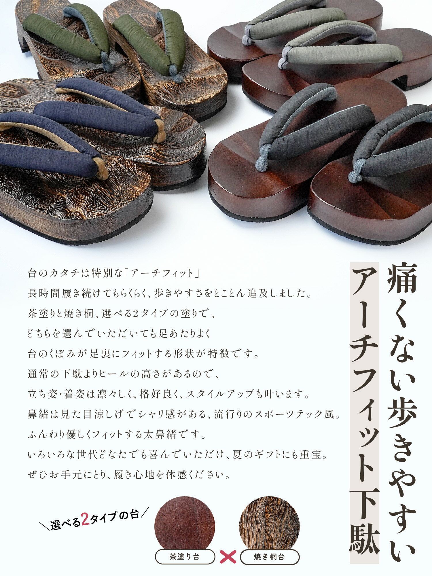 【新作】下駄 メンズ 紳士 浴衣 普段履き アーチフィット 痛くない 太鼻緒 F寸 足形 スタイルアップ 男性用 桐下駄 茶塗り 焼き桐 夏 メンズ下駄 和装 男 痛くない 脚長効果 クール おしゃれ ハイセンス 浴衣下駄 作務衣 甚平 草履 かっこいい 茶台 木目 天然木 EVA ゴム底
