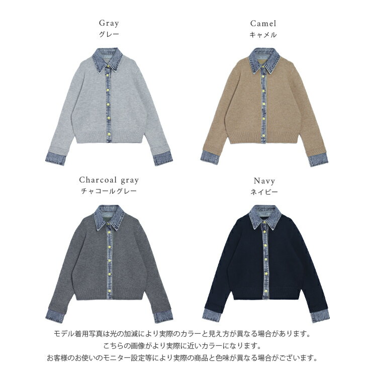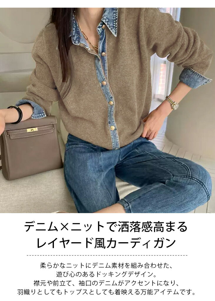 【半額クーポン対象】レイヤード風 デニム ニット カーディガン ドッキング 襟付き カジュアル 重ね着風 長袖 レディース 2025秋冬新作【atpaw25-1764】【予約販売:12月18日入荷予定順次発送】【送料無料】宅込
