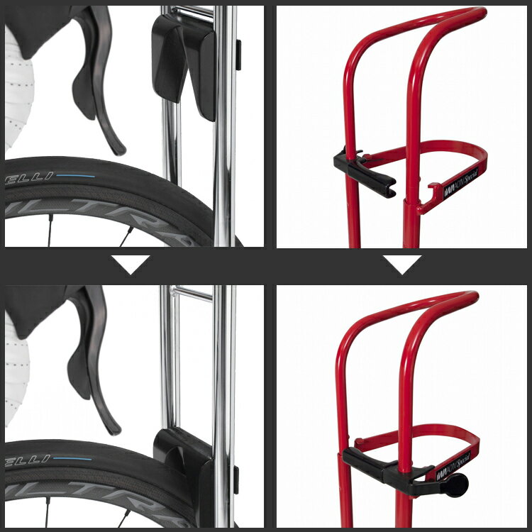縦横どちらでも設置可能!オシャレなスタンド! 収納可能タイヤ幅が前機種より大きくなりました。 品名 IWA A01V SPECIAL 室内保管用縦置き横置き型バイクスタンド 品番 A01V-SP 本体サイズ W530mm×D650mm×H1460〜1825mm 商品重量 7.2kg 材質 スチール(ホイール受け部PEコーティング) 対応バイク ロードバイク、クロスバイク、マウンテンバイク、ミニベロ、シクロクロス、グラベルバイク、Eバイク、セミファットバイク タイヤ直径 20〜29インチ(自転車を立てて床面からフロントハブまでの長さ165cmまで) タイヤ幅 82mm(3.2インチ)まで 前輪ハイト 90mm(タイヤハイト+リムハイト)まで ※700cホイールはリムハイト60mmまで対応 耐荷重 30kgまで カラー ブラック レッド ホワイト チェレステカラー ブラック/シルバー 特徴 調整可能な樹脂パーツ(意匠登録)によりバイクを縦にも横にも保管できます。 固定方法がオートロック式なので前輪を差し込むだけでバイク固定完了。解除も片手で楽々。 バイクに優しく、自由度の高いロック機構 力学的設計による優れた安定性があり、風の中でもしっかりバイクを保持してくれます。 ※直立性を確約するものではありません。 注意事項 泥よけ付き等により自転車を垂直にできないもの、電動アシスト自転車はご使用いただけません。 メーカーの製造時期・ロットにより商品の仕様やカラー等が予告なく変更された際、掲載画像と異なる場合があります。 仕様変更の理由による返品・交換はお受けしておりません。ご不安な場合は事前にお問合せ下さい。