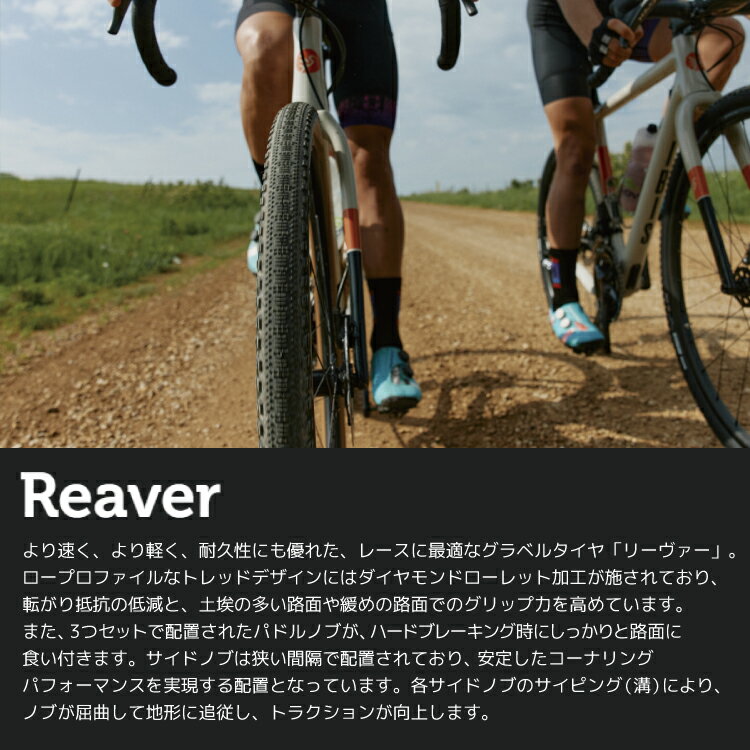 ・メーカー希望小売価格はメーカーサイトに基づいて掲載しています より速く、より軽く、耐久性にも優れた、レースに最適なグラベルタイヤ 品名 MAXXIS REAVER 品番 MXS-REAVER タイプ チューブレス レディ チューブとセットも選択可能 MAXXIS WELTER WEIGHT 仏式48mm チューブとのセットもございます サイズ 700 x 40C 700 x 45C カラー ブラック タンウォール ビード ケブラー ケーシング 120TPI テクノロジー EXOプロテクション コンパウンド デュアル 推奨空気圧 35-60PSI 重量 700 x 40C 437g 700 x 45C 495g 特徴 より速く、より軽く、耐久性にも優れた、レースに最適なグラベルタイヤ「リーヴァー」 ロープロファイルなトレッドデザインにはダイヤモンドローレット加工が施されており、 転がり抵抗の低減と、土埃の多い路面や緩めの路面でのグリップ力を高めています。 また、3 つセットで配置されたパドルノブが、ハードブレーキング時にしっかりと路面に食い付きます。 サイドノブは狭い間隔で配置されており、安定したコーナリングパフォーマンスを実現する配置となっています。 各サイドノブのサイピング(溝)により、ノブが屈曲して地形に追従し、トラクションが向上します。 注意事項 メーカーの製造時期・ロットにより商品の仕様やカラー等が予告なく変更された際、掲載画像と異なる場合があります。 仕様変更の理由による返品・交換はお受けしておりません。ご不安な場合は事前にお問合せ下さい。 代表的な車種 ロードバイク : クロスバイク : シクロクロス : ピストバイク 【 台湾 】 GIANT( ジャイアント )MERIDA( メリダ ) 【 イタリア 】 Bianchi( ビアンキ )GIOS( ジオス )Pinarello( ピナレロ ) 【 イタリア 】Ugo De Rosa & Figli ( デローザ ) 【 アメリカ 】 GT( ジーティー ) Cannondale ( キャノンデール )Dahon ( ダホン ) 【 カナダ 】 LOUISGARNEAU( ルイガノ ) Specialized( スペシャライズド )MIYATA(ミヤタサイクル) PANASONIC(パナソニック) BRIDGESTONE(ブリヂストン)ブリジストン パナ BS