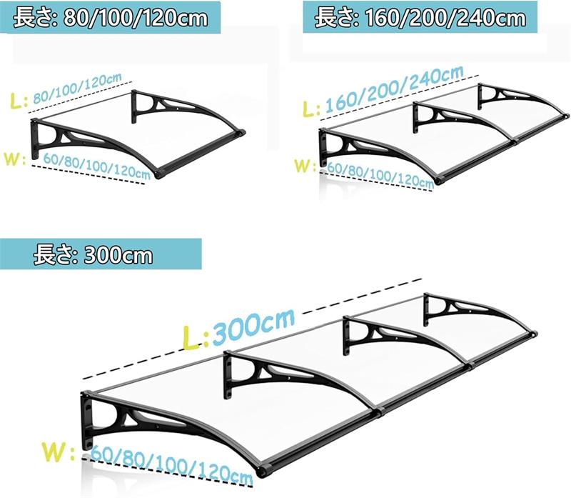 【ポリカーボネートボードとアルミ合金ブラケット】ポリカーボネートボードは、1平方メートルあたり100KGに耐えることができる強力な支持力を持ち、粉砕に強いです。合金ブラケットは、高い硬度と耐酸化性を持ち、長寿命です【悪天候への対応 梅雨対策】ひさし雨よけ屋根はキャノピーは、寒い雪の冬、暑くて高温の夏、雹の天気、台風の天気で窓やファサードを保護し、10台の台風に耐えることができます。冬や雨の季節には滑りやすい入り口はありません【モダンなデザイン】サンシェードカバーは レインキャノピーが水を溜めないように湾曲したデザインで、雨水を使ってキャノピーを掃除できる、衣類のロッドソケット、衣類の乾燥のニーズを満たすことができ、機能的な製品であると同時に装飾的な製品でもあります【利点】日除けシェルター フロントバックドアはノイズ低減と遮音、雨の日にボード表面に当たる雨の音は60Dと低く、良好な照明、透明なボード照明、曇りのない長期使用、耐久ボードの表面のUV層は自然光で紫外線を浄化し、家の中を純粋な光で照らします【使用シナリオ】テラスの窓の軒、正面玄関と背面のドアの入り口、ショーウィンドウ、バス待合所、露出した電化製品、防水👍【アンカーボルトに関しての問題】膨張ネジは10 MMのセメントドリルを使用して穴を開け、膨張ネジをひさしのブランケットを通過して壁に打ち込む必要があります。膨張ネジによりひさしが壁面にしっかり固定されて脱落できず、10級台風に対抗することができます。標準のアンカーボルトでは、ひさしに強い抗風能力と荷重能力を持たせることはできません【ポリカーボネートボードとアルミ合金ブラケット】ポリカーボネートボードは、1平方メートルあたり100KGに耐えることができる強力な支持力を持ち、粉砕に強いです。合金ブラケットは、高い硬度と耐酸化性を持ち、長寿命です【悪天候への対応 梅雨対策】ひさし雨よけ屋根はキャノピーは、寒い雪の冬、暑くて高温の夏、雹の天気、台風の天気で窓やファサードを保護し、10台の台風に耐えることができます。冬や雨の季節には滑りやすい入り口はありません【モダンなデザイン】サンシェードカバーは レインキャノピーが水を溜めないように湾曲したデザインで、雨水を使ってキャノピーを掃除できる、衣類のロッドソケット、衣類の乾燥のニーズを満たすことができ、機能的な製品であると同時に装飾的な製品でもあります【利点】日除けシェルター フロントバックドアはノイズ低減と遮音、雨の日にボード表面に当たる雨の音は60Dと低く、良好な照明、透明なボード照明、曇りのない長期使用、耐久ボードの表面のUV層は自然光で紫外線を浄化し、家の中を純粋な光で照らします【使用シナリオ】テラスの窓の軒、正面玄関と背面のドアの入り口、ショーウィンドウ、バス待合所、露出した電化製品、防水👍【アンカーボルトに関しての問題】膨張ネジは10 MMのセメントドリルを使用して穴を開け、膨張ネジをひさしのブランケットを通過して壁に打ち込む必要があります。膨張ネジによりひさしが壁面にしっかり固定されて脱落できず、10級台風に対抗することができます。標準のアンカーボルトでは、ひさしに強い抗風能力と荷重能力を持たせることはできません