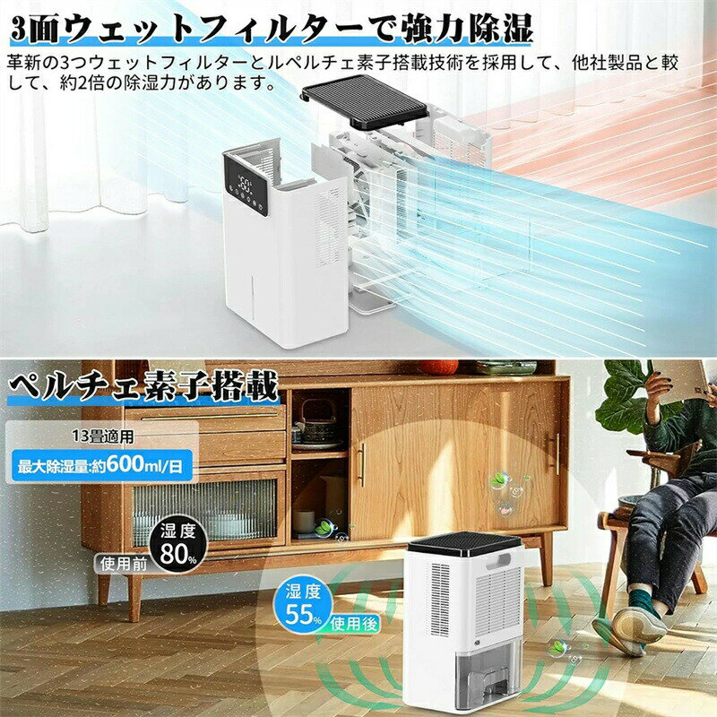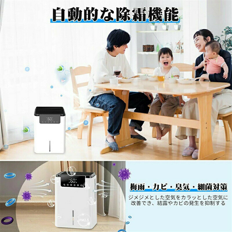 商品情報商品名 卓上除湿機カラー ホワイト商品寸法 #内容#商品重さ 286*200*140mm(約)定格入力 110V 50Hz定格出力 40WPSE認証 認証取得サービス 一年保証、30日内返金制度商品特徴湿気対策・衣類乾燥・空気浄化・全新進化のペルチェ式除湿機 DE-HDF-02は新しい機能「衣類乾燥機能」を搭載しましたペルチェ式除湿機です。小型化と省エネに加え、従来のペルチェ式除湿機にはなかった衣類乾燥機能を追加し、洗濯物をより早く乾かすことができます。梅雨時期に洗濯物から生乾きの臭いがしやすいため、DE-HDF-02は、空気を浄化でき、匂いを抑える「マイナスイオン機能」も搭載しました。マイナスイオン発生器は、空気中に放出したマイナスイオンによって臭いを低減することができます。衣類のイヤな臭いを抑制しながら、衣類をより早く乾かします。2.2L大容量水タンク・満水自動停止・満水お知らせ 2.2L大容量水タンクを搭載し、排水の頻度を減らせます。除湿機の正面水位窓は水位線を示して、水の溜まり具合が一目瞭然。満水になると赤ランプが点灯して自動運転停止になり、水漏れの心配はありません。水タンクの構造はシンプルなので、お手入れもラクラク。狭いスペーなら、この一台で十分、省スペースで使いやすい シンプルでスタイリッシュなデザインが魅力です。どんな場所に設置するも周囲の環境に完璧に溶けます。約A4サイズの半分設置面積で狭いスペースでも楽に使えます。玄関やクローゼット、洗面所など湿気が気になる空間に設置しやすい。7色の雰囲気ライト・お休みモード・24時間切りタイマー 除湿機操作部のライトボタンを押すと、7色の雰囲気ライトが切り替えできます。ライトボタンを長押すと、雰囲気ライトをオフになります。お休みボタンを押すと、雰囲気ライトがオフになり、除湿機の運転音も減らすになり,睡眠を邪魔しません。運転時の騒音や振動が抑えられた静音設計なので、自宅はもちろんオフィスでも気兼ねなく使用できます。商品情報商品名 卓上除湿機カラー ホワイト商品寸法 #内容#商品重さ 286*200*140mm(約)定格入力 110V 50Hz定格出力 40WPSE認証 認証取得サービス 一年保証、30日内返金制度商品特徴湿気対策・衣類乾燥・空気浄化・全新進化のペルチェ式除湿機 DE-HDF-02は新しい機能「衣類乾燥機能」を搭載しましたペルチェ式除湿機です。小型化と省エネに加え、従来のペルチェ式除湿機にはなかった衣類乾燥機能を追加し、洗濯物をより早く乾かすことができます。梅雨時期に洗濯物から生乾きの臭いがしやすいため、DE-HDF-02は、空気を浄化でき、匂いを抑える「マイナスイオン機能」も搭載しました。マイナスイオン発生器は、空気中に放出したマイナスイオンによって臭いを低減することができます。衣類のイヤな臭いを抑制しながら、衣類をより早く乾かします。2.2L大容量水タンク・満水自動停止・満水お知らせ 2.2L大容量水タンクを搭載し、排水の頻度を減らせます。除湿機の正面水位窓は水位線を示して、水の溜まり具合が一目瞭然。満水になると赤ランプが点灯して自動運転停止になり、水漏れの心配はありません。水タンクの構造はシンプルなので、お手入れもラクラク。狭いスペーなら、この一台で十分、省スペースで使いやすい シンプルでスタイリッシュなデザインが魅力です。どんな場所に設置するも周囲の環境に完璧に溶けます。約A4サイズの半分設置面積で狭いスペースでも楽に使えます。玄関やクローゼット、洗面所など湿気が気になる空間に設置しやすい。7色の雰囲気ライト・お休みモード・24時間切りタイマー 除湿機操作部のライトボタンを押すと、7色の雰囲気ライトが切り替えできます。ライトボタンを長押すと、雰囲気ライトをオフになります。お休みボタンを押すと、雰囲気ライトがオフになり、除湿機の運転音も減らすになり,睡眠を邪魔しません。運転時の騒音や振動が抑えられた静音設計なので、自宅はもちろんオフィスでも気兼ねなく使用できます。