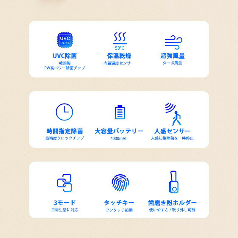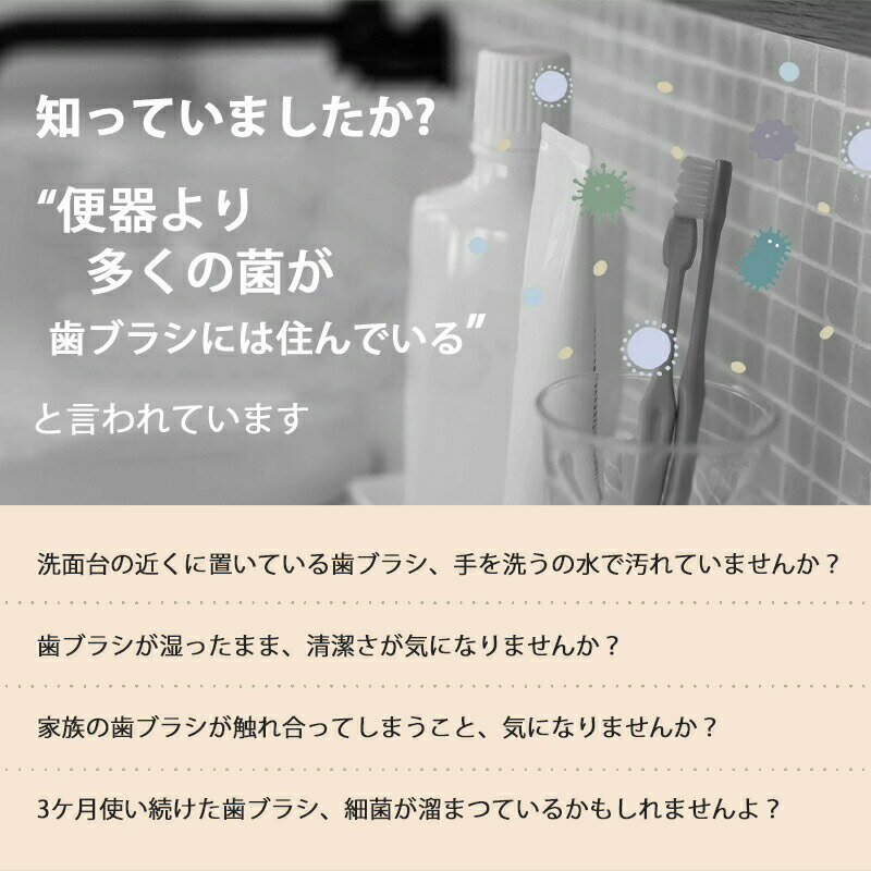 【深紫外線UV-C LED除菌システム】254nmの波長で強力除菌を実現し、歯ブラシの雑菌を細胞レベルで除去します。現役歯科医師監修の信頼できる設計です。【簡単取付と便利な時計機能】強力両面テープで壁に穴を開ける必要がなく、スタイリッシュな収納デザインと便利な時計表示機能を搭載しています。【除菌&乾燥のダブル機能】除菌3分+乾燥8分の徹底ケアで、デジタル残時間表示付き。UVCライトとファンによる効果的な除菌システムです。【3モード切替&便利な自動除菌システム】通常(180秒除菌+8分乾燥) / 強力(360秒除菌+30分乾燥) / 自動 1日4回(6時、7時、21時、22時)の定期的な自動除菌で、いつでも清潔な歯ブラシをご使用いただけます。【人感センサー】人が近づくと自動停止→ディスプレイ点灯。紫外線曝露リスクを完全遮断。【ターボ乾燥+保温機能】寒い冬も50℃恒温維持(NTCスマート温度制御)カビの原因となる湿気を強力排除【分離式洗浄設計】カップ本体丸洗い可能歯ブラシを徹底的に清潔に保ち、嫌な臭いを解消することで、ご家庭はもちろん、出張や旅行、キャンプなどの持ち運びや学校、会社の昼食後に最適なアイテムとしておすすめします。清潔さを保ちながら心地よい口当たりを提供し、いつでも爽快な口元を実現します。美しいデザインと便利な持ち運び性が、日常生活に一層の快適さをもたらします。関連キーワード歯ブラシ 除菌 歯ブラシケース 除菌ケース 除菌器 ファン 歯ブラシ除菌器 カビ防止 梅雨対策【深紫外線UV-C LED除菌システム】254nmの波長で強力除菌を実現し、歯ブラシの雑菌を細胞レベルで除去します。現役歯科医師監修の信頼できる設計です。【簡単取付と便利な時計機能】強力両面テープで壁に穴を開ける必要がなく、スタイリッシュな収納デザインと便利な時計表示機能を搭載しています。【除菌&乾燥のダブル機能】除菌3分+乾燥8分の徹底ケアで、デジタル残時間表示付き。UVCライトとファンによる効果的な除菌システムです。【3モード切替&便利な自動除菌システム】通常(180秒除菌+8分乾燥) / 強力(360秒除菌+30分乾燥) / 自動 1日4回(6時、7時、21時、22時)の定期的な自動除菌で、いつでも清潔な歯ブラシをご使用いただけます。【人感センサー】人が近づくと自動停止→ディスプレイ点灯。紫外線曝露リスクを完全遮断。【ターボ乾燥+保温機能】寒い冬も50℃恒温維持(NTCスマート温度制御)カビの原因となる湿気を強力排除【分離式洗浄設計】カップ本体丸洗い可能歯ブラシを徹底的に清潔に保ち、嫌な臭いを解消することで、ご家庭はもちろん、出張や旅行、キャンプなどの持ち運びや学校、会社の昼食後に最適なアイテムとしておすすめします。清潔さを保ちながら心地よい口当たりを提供し、いつでも爽快な口元を実現します。美しいデザインと便利な持ち運び性が、日常生活に一層の快適さをもたらします。関連キーワード歯ブラシ 除菌 歯ブラシケース 除菌ケース 除菌器 ファン 歯ブラシ除菌器 カビ防止 梅雨対策