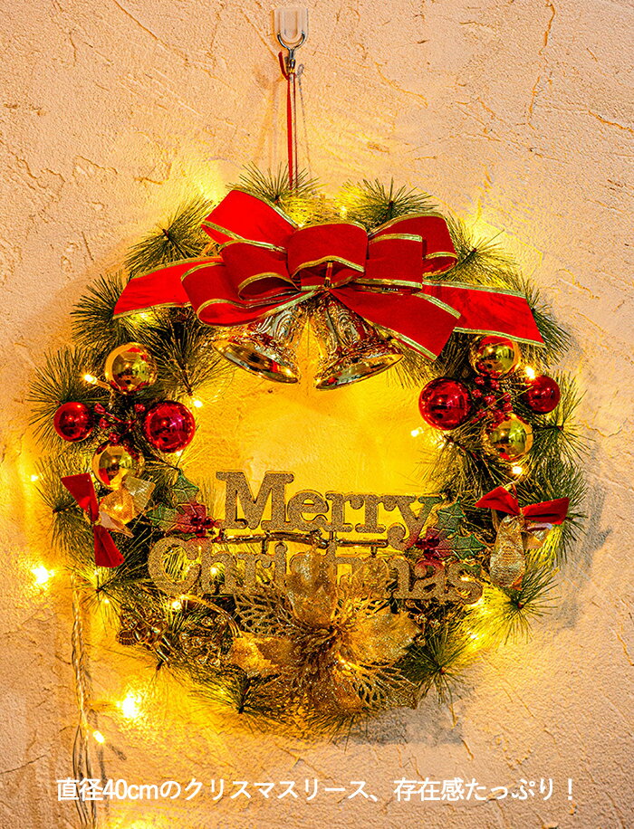 【楽天ス一パ一セ一ル10%OFF】クリスマスリース 40cm クリスマス ベル ボール リボン付き 玄関リース LEDライト 電球色 イルミネーション オーナメント 華やか クリスマス飾り おしゃれ 壁掛け 壁飾り 北欧風 インテリア リース ドア 玄関