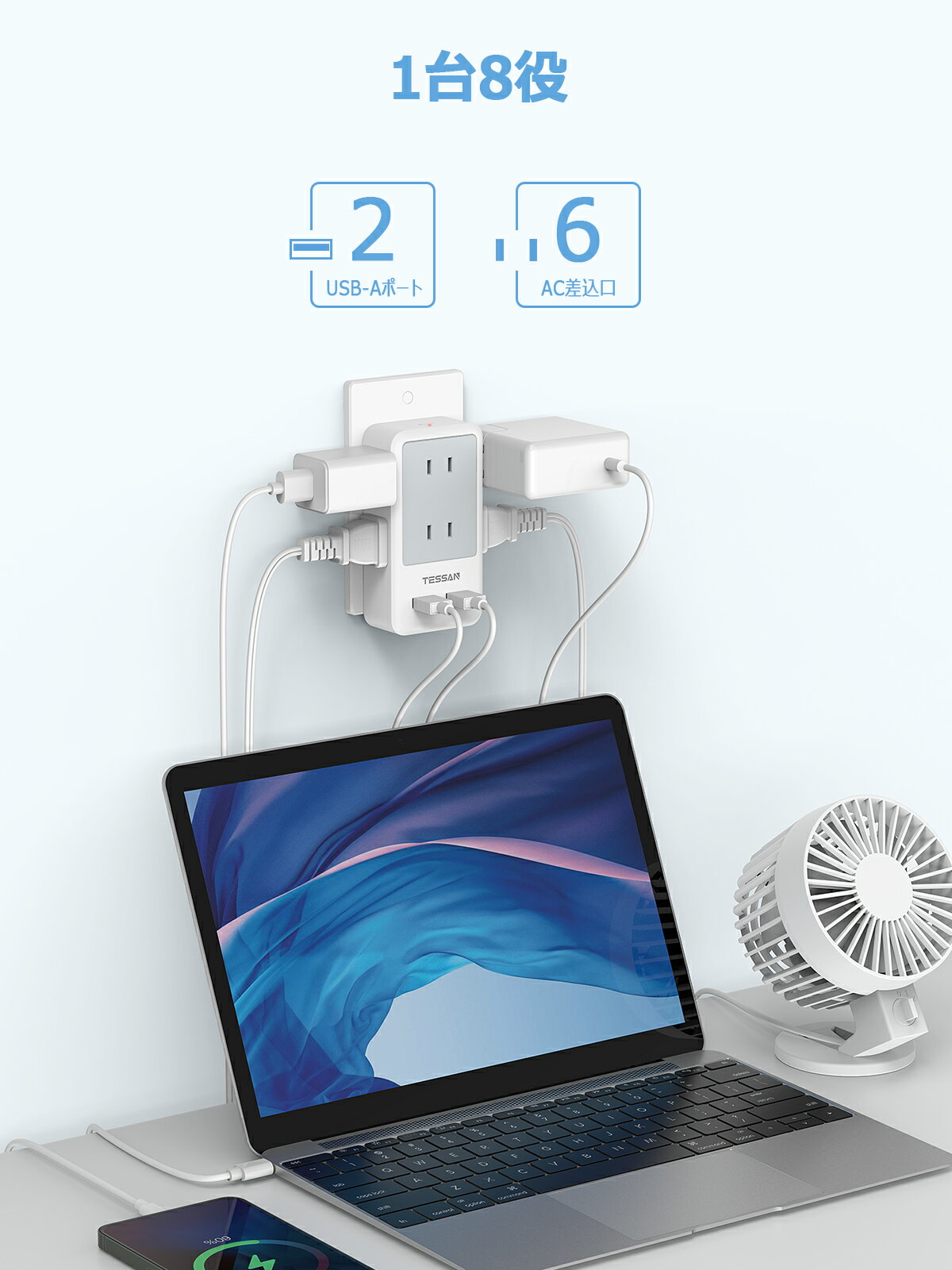 TESSAN コンセントタップ 電源タップ usb付き 6個AC口 2つUSBポート 蛸足コンセント 分岐 マルチタップ 充電タップ 直挿しタップ 雷ガード 小型