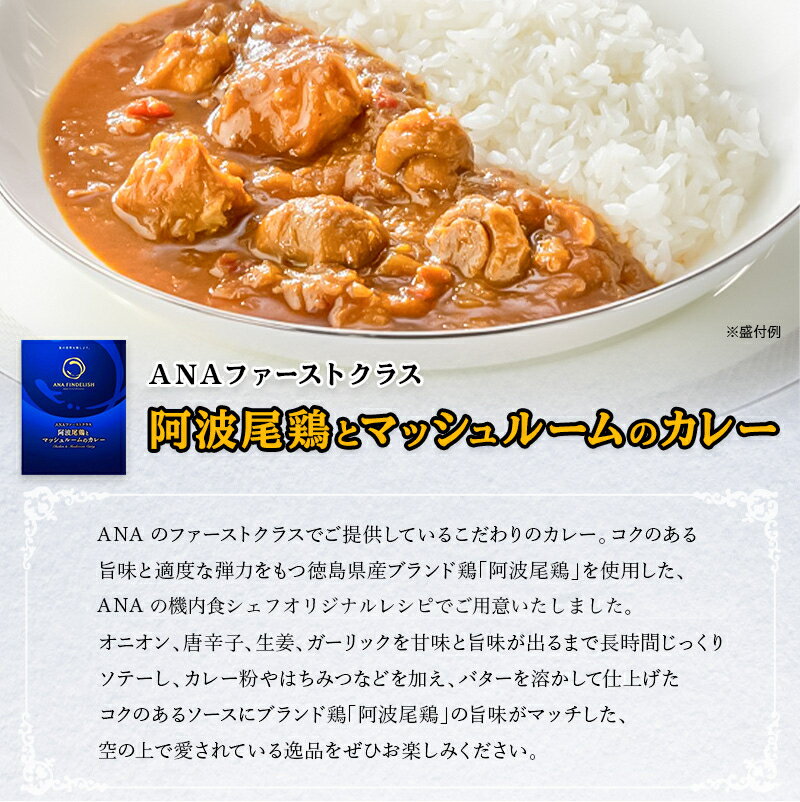 ANAのファーストクラスでご提供している阿波尾鶏とマッシュルームのカレー3個、ANA全クラスの機内食を担当するシェフが監修したビーフカレー1個、チキンカレー1個、ポークカレー1個の計6個が入ったセットです。 阿波尾鶏とマッシュルームのカレー ANAのファーストクラスでご提供しているこだわりのカレー。コクのある旨味と適度な弾力をもつ徳島県産ブランド鶏「阿波尾鶏」を使用した、ANA全クラスの機内食を担当するシェフオリジナルレシピでご用意いたしました。オニオン、唐辛子、生姜、ガーリックを甘味と旨味が出るまで長時間じっくりソテーし、カレー粉やはちみつなどを加え、バターを溶かして仕上げたコクのあるソースにブランド鶏「阿波尾鶏」の旨味がマッチした、空の上で愛されている逸品をぜひお楽しみください。 ビーフカレー ビーフの旨味をひき立てるフルーツのすっきりとした甘さと爽やかな酸味、後から追いかけてくるスパイシーな辛さがくせになります。旨味の強いウデ肉をブイヨンで煮込み、お肉の旨味を余すことなくソースに溶け込ませた逸品です。甘味、酸味、辛味が絶妙に絡み合った、また食べたくなるビーフカレーをぜひご堪能ください。 チキンカレー トマトとあめ色のソテーオニオンをソースに溶かし込むことで、野菜が持つ甘味と旨味、すっきりとした酸味を引き出しました。やわらかい鶏もも肉の旨味とバターのマイルドなコクを中国醤油ですっきりとひきしめた逸品です。食欲をそそるにんにくの香りが際立つ、優しい美味しさのチキンカレーをぜひご堪能ください。 ポークカレー 昆布エキスとマッシュルームエキス、和と洋の両方の旨味をベースにし、醤油とウスターソースを加えて日本人に親しみやすい味に仕上げました。丁寧に下茹でした豚ばら肉にはクセが少なく、まろやかな旨味とキレのある辛味を感じられる逸品です。何度食べても飽きのこないポークカレーをぜひご堪能ください。 名称 カレー 内容量 阿波尾鶏とマッシュルームのカレー (180g)3食 ビーフカレー (180g)1食 チキンカレー (180g)1食 ポークカレー (180g)1食 原材料名 阿波尾鶏とマッシュルームのカレー野菜(たまねぎ(国産)、マッシュルーム(中国産))、鶏肉(徳島県産)、バター、にんにくペースト、しょうがペースト、トマト・ジュースづけ、大豆油、トマトケチャップ、カレー粉、チキンエキス、はちみつ、ばれいしょでん粉、ビーフコンソメパウダー、食塩、小麦粉、香辛料 / 調味料(アミノ酸等)、カラメル色素、酸味料、香料、(一部に小麦・乳成分・牛肉・大豆・鶏肉を含む) ビーフカレー牛肉(オーストラリア産)、ソテーオニオン、生クリーム、濃縮ビーフブイヨン、砂糖、牛脂、りんごピューレ、バター、小麦粉、カレー粉、バナナピューレ、にんじんピューレ、植物油脂、食塩、香辛料、チャツネ、レモンジュース、しょうがペースト/カラメル色素、乳化剤、酸味料、(一部に小麦・乳成分・牛肉・バナナ・りんごを含む) チキンカレー鶏肉(タイ産)、ソテーオニオン、バター、しょうがペースト、チキンエキス、トマト・ピューレーづけ、にんにくペースト、植物油脂、カレー粉、トマトケチャップ、砂糖、はちみつ、チャツネ、小麦粉、食塩、ばれいしょでん粉、中国しょうゆ、香辛料、酵母エキス/酸味料、(一部に小麦・乳成分・大豆・鶏肉・豚肉を含む) ポークカレー豚肉(チリ産)、ソテーオニオン、小麦粉、牛脂、しょうゆ、生クリーム、カレー粉、しょうがペースト、トマトペースト、植物油脂、砂糖、濃縮ビーフブイヨン、ウスターソース、ゼラチン、ポークエキス、チキンエキス、こんぶエキス、香辛料、酵母エキス、マッシュルームエキス調味料、濃縮パインアップル果汁、食塩/カラメル色素、(一部に小麦・乳成分・牛肉・大豆・鶏肉・豚肉・ゼラチンを含む) 栄養成分表示 1袋(180g)あたり 阿波尾鶏とマッシュルームのカレーエネルギー 280kcal、たんぱく質 11.7g、脂質 17.6g、炭水化物 18.7g、食塩相当量 2.0g ビーフカレーエネルギー 356kcal、たんぱく質 14.6g、脂質 23.0g、炭水化物 22.7g、食塩相当量 2.3g チキンカレーエネルギー 272kcal、たんぱく質 14.8g、脂質 15.3g、炭水化物 18.9g、食塩相当量 2.2g ポークカレーエネルギー 295kcal、たんぱく質 13.1g、脂質 19.1g、炭水化物 17.6g、食塩相当量 1.9g アレルギー * 阿波尾鶏とマッシュルームのカレー小麦・乳成分・牛肉・大豆・鶏肉 ビーフカレー小麦・乳成分・牛肉・バナナ・りんご チキンカレー小麦・乳成分・大豆・鶏肉・豚肉 ポークカレー小麦・乳成分・牛肉・大豆・鶏肉・豚肉・ゼラチン *原材料に含まれる、国内で表示義務付け・推奨するもの 保存方法 直射日光を避け、常温で保存してください 賞味期限 出荷時に120日以上のものをお届けいたします。 ※賞味期限は製造を基準にパッケージに記載しております。 販売者 株式会社ANAケータリングサービス東京都大田区羽田空港3-2-8 製造所 有田食品株式会社和歌山県有田市箕島743 【お祝いや内