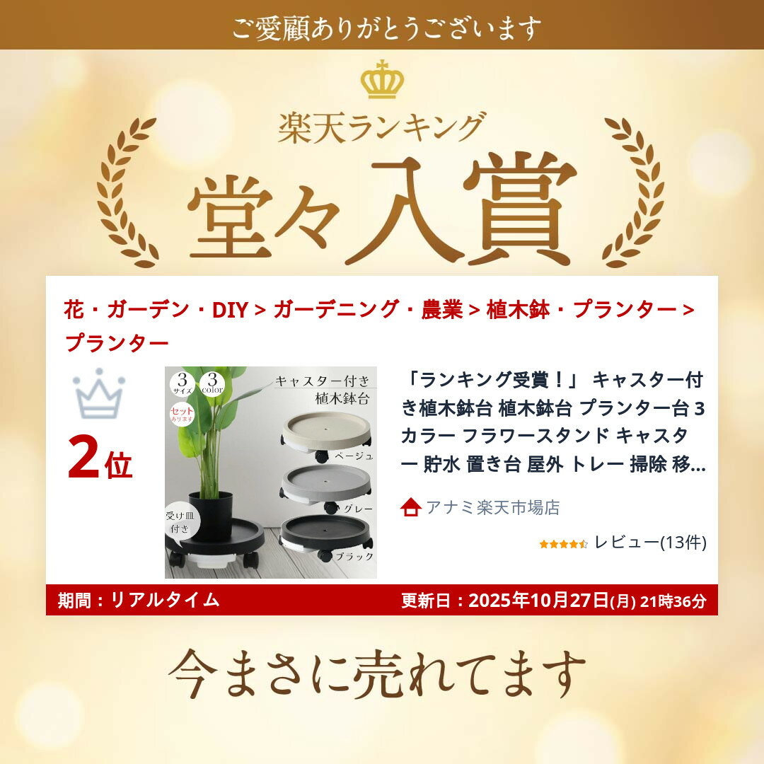 【キャスター付き植木鉢台】さまざまな形状の植木鉢に対応しており、植木鉢、花瓶、大型植物鉢を簡単に移動でき、床を傷つけることなく、移動ができます。2つのキャスターはロックできるので、安定感があり安心♪貯水タンク付きで根腐れの心配もなく、たまった水を捨てることができます。【貯水付きプランター】植木鉢の下にトレイを敷くと土が通気しなくなり、植物の根が腐る原因になります。この貯水付きプランターを使用すると、トレーに水を貯めることができ、植物の根を常に換気をして、より健やかに成長させることができます。水やりをするときに余分な水を集穴から落とし貯水トレーに貯まるので、フローリングが濡れるのを防ぐことができます。室内、屋外、庭、リビングルーム、ダイニングルームなど、様々な場所で活躍します。【カラー】ブラック、グレー、ベージュの使いやすい3色です♪※日本語取扱説明書、撮影用小物類などは付属しておりません。※簡易包装でのお届けとなります。※モニターにより色合いが若干違いが生じる場合がございます。※デザインは入荷時期により若干変化する場合がございます※海外製造品のため、多少の匂い軽微な傷や汚れ、個体差等ある場合がございます。※商品の使用により生じた如何なる損害・被害も弊社では一切の責任を負いかねますので予めご了承ください。※発送方法について:お届け先、個数によって配送情報に記載の配送業者とは異なる場合がございます。日本郵便、または佐川急便(配送方法はご指定頂けません)でお届けいたします。
