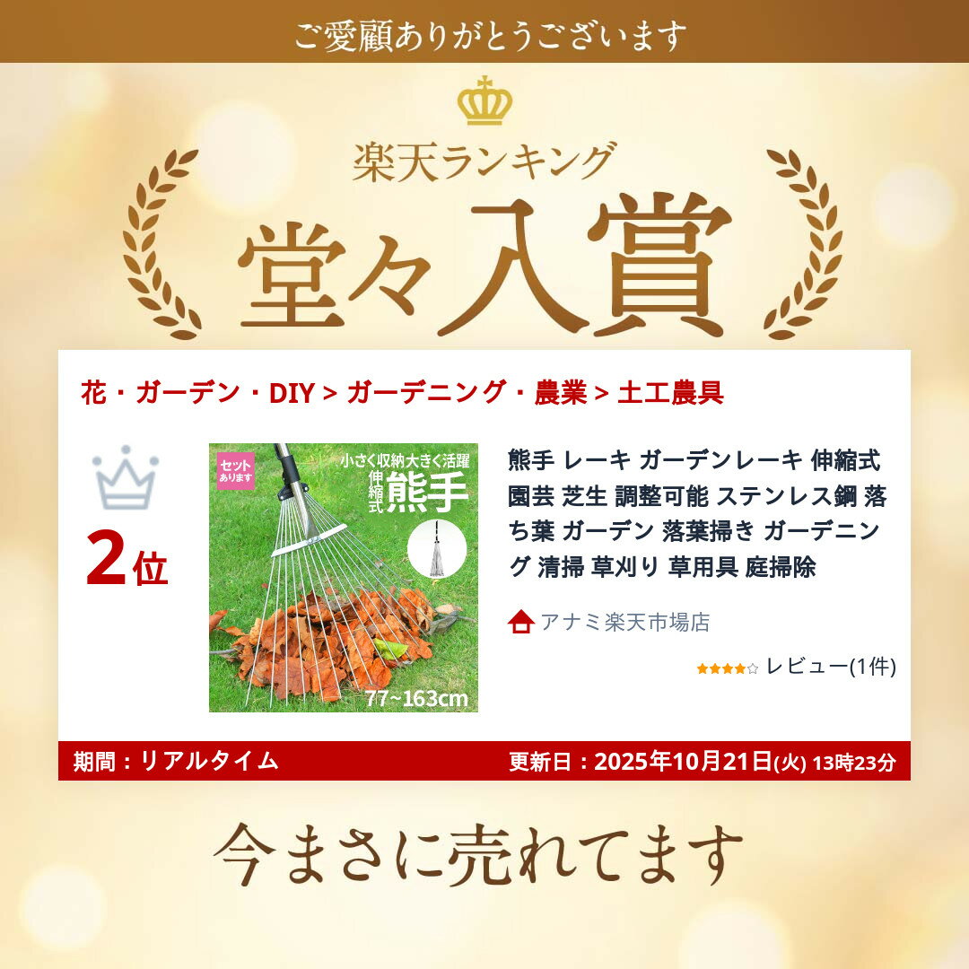 【長さ&レーキ幅調整可能】長さとレーキの幅を調整可能で、ワンタッチor回転で調整することができます。柄の部分を回転させることで77cmから163cmまでサイズ変更できます。15本の歯の幅は19~53cmで、その間のお好きな位置にロックでき、環境に合わせて効率的に葉を集めることができます。全長は163cm、折りたたみサイズは77cmです。ラその間のお好きな長さにロックすることができます。【幅広い用途の清掃に】落ち葉、草の刈り取り後、芝生のゴミ等を簡単かつ迅速に清掃でき、植物を傷つけません。調整可能なデザインのため、狭いエリア、例えば生け垣の下や花壇の間などで活躍します。庭園、落ち葉、芝生、人工芝、雑草の掃除に理想的なツールです。また、葉や松ぼっくりを拾うのにも大変便利です。【収納も携帯も便利】熊手は高品質の鋼構造で、日光やその他の環境要素からの損傷に耐えることできます。スナップバックルデザインで、ラックを調整した後、反対方向に回してラックを固定します。軽量の伸縮ハンドルで、保管が簡単です。滑り止めハンドルで、使用中に滑り落ちることはありません。使用しない時は吊るすか分解して保管でき、省スペースです。【サイズ】最小:約77x19cm最大:約163cmx53cm重量:約770g※日本語取扱説明書、撮影用小物類などは付属しておりません。※簡易包装でのお届けとなります。※モニターにより色合いが若干違いが生じる場合がございます。※デザインは入荷時期により若干変化する場合がございます※海外製造品のため、多少の匂い軽微な傷や汚れ、個体差等ある場合がございます。※商品の使用により生じた如何なる損害・被害も弊社では一切の責任を負いかねますので予めご了承ください。※発送方法について:お届け先、個数によって配送情報に記載の配送業者とは異なる場合がございます。大型商品扱いの商品のため、発送は西濃スーパーエクスプレスでの発送となります。