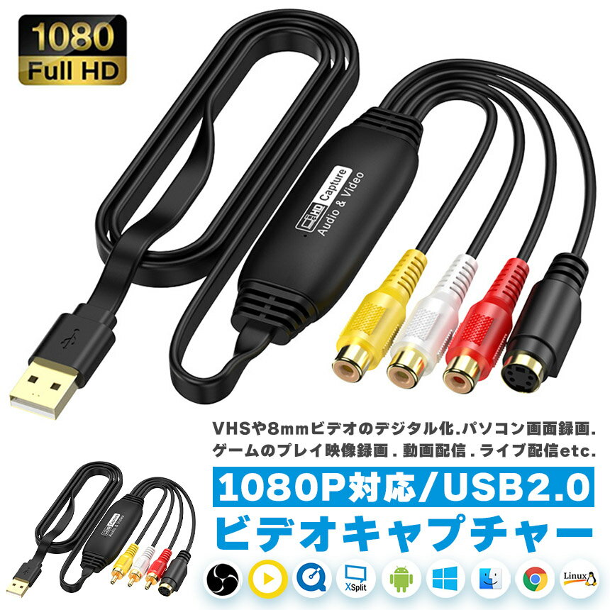 【VHS・8mmビデオ等をDVDに】昔録りためたVHSのテープや、古い8mmビデオテープを、PCに取り込んでデータ化してDVDに簡単に保存することができます。簡単な編集もでき、編集したデータをオリジナルDVDにできます。【簡単操作でビデオ映像をデジタル保存】映像編集ソフトはいりません。挿してそのまま使えます。ビデオデッキやゲーム機などに接続して、映像をデジタル保存できます。簡単にデータを保存できるうえ、ビデオテープのように劣化することがないので長期保存できます。【対応幅が広い】ビデオキャプチャーはほとんどのフォーマットをサポート:DVD +/- R / RW、DVD / -VCR、およびDVDビデオでの録画です。ゲームをしながらプレイ実況を保存: PS・WiiU/Wiiなどのゲーム機から、GC・N64・SFC・NEW FCといったレトロゲーム機まで使用できます。ゲーム映像をストリーミングサイト(Youtube・ニコ生・ツイキャスなど)にてライブ配信などができます。【初めてでもOK】使用開始は、添付のCD-ROMを入れて1クリックでインストール完了できます。【Windows & Mac 対応】Windows 11/10/8/7/XP、Mac OSのシステムに対応しています。 ほとんどのWindowsとMACに対応しているので、新しいバージョンのPCでも互換性がないことを心配する必要はありません。NTSC、PALビデオ標準フォーマットに対応。【製品】品名:USB2.0ビデオキャプチャー オスタイプまたはメスタイプカラー:ブラックビデオフォーマット: NTSC/PALインターフェース: 赤と白の RCA オーディオ インターフェース、黄色の RCA ビデオ インターフェース、S ビデオ機能: オーディオとビデオの取得、録画、再生をサポートインジケーターライト: あり付属品:ソフトウェアCD※日本語取扱説明書、撮影用小物類などは付属しておりません。※簡易包装でのお届けとなります。※モニターにより色合いが若干違いが生じる場合がございます。※デザインは入荷時期により若干変化する場合がございます※海外製造品のため、多少の匂い軽微な傷や汚れ、個体差等ある場合がございます。※商品の使用により生じた如何なる損害・被害も弊社では一切の責任を負いかねますので予めご了承ください。※発送方法について:お届け先、個数によって配送情報に記載の配送業者とは異なる場合がございます。日本郵便、佐川急便、ヤマト運輸、またはセイノーエクスプレス(大型商品)でお届けいたします。なお、配送業者はお選びいただけませんので、ご了承ください。
