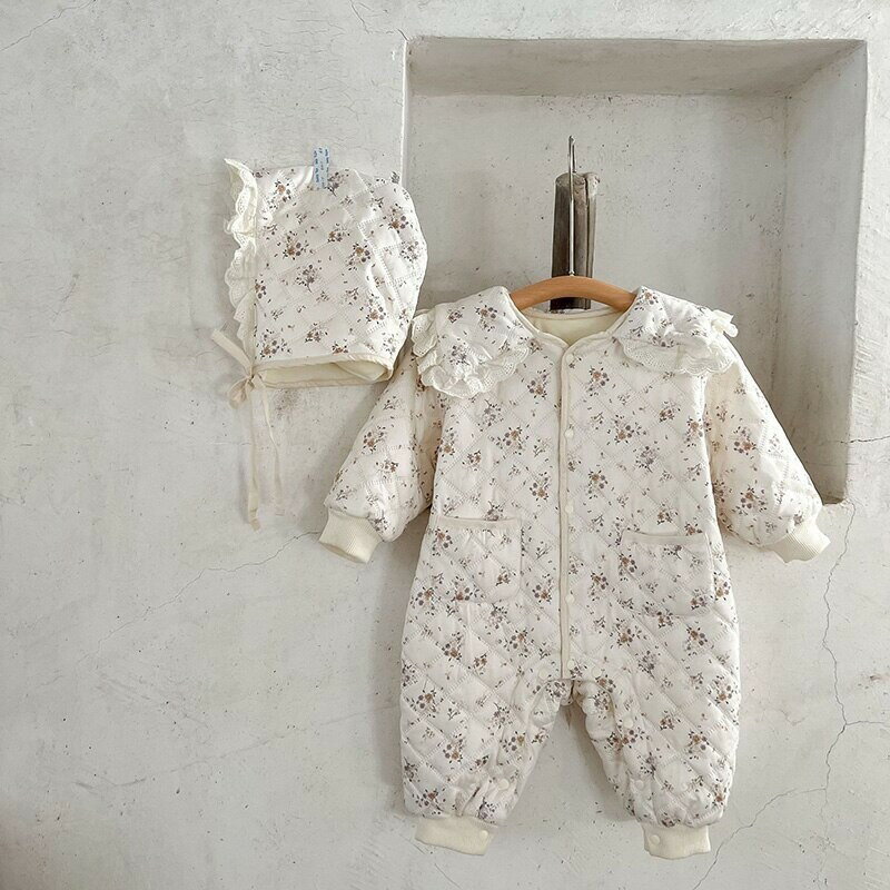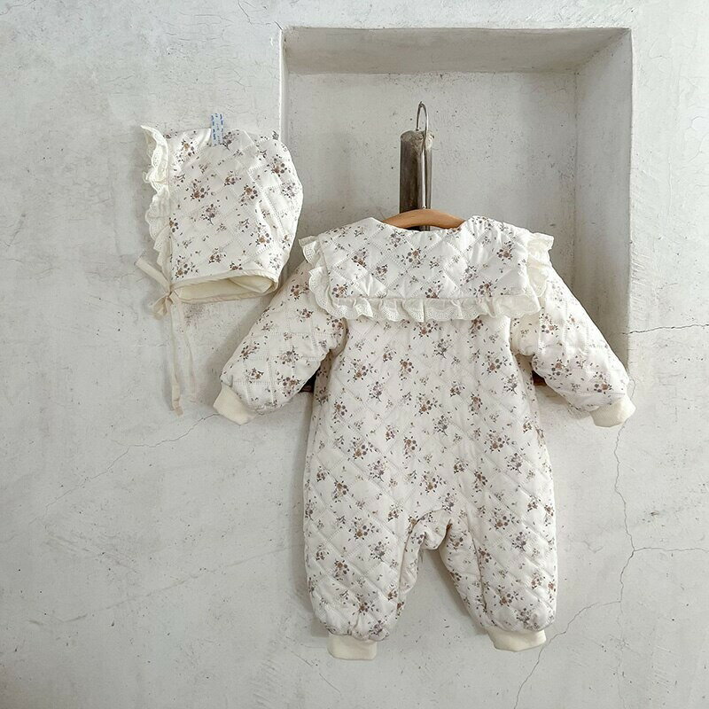 キッズ 小花防寒キルティングロンパース 帽子付き 韓国子供服 66cm〜100cm