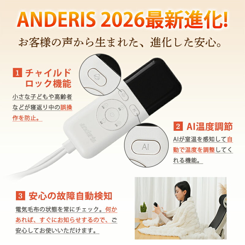 品名anderis 電気毛布サイズ190×130cm重さ1.74kg定格100V 50/60Hz 70w生地ポリエステル100%カラーベージュ、ホワイトパッケージ内容電気毛布、コントローラー、専用収納ポーチ、洗濯ネット、日本語取扱説明書PSE認証PSE認証済み商品説明【30秒で速熱】通電後わずか30秒で表面温度が15℃+。細い発熱線(直径0.15mm)をハニカム状に配置し熱を逃がさず素早く効率的に体を温める。【AIによるスマート温度調整】内蔵センサーとマイクロチップで環境温度・体温を感知し、自動で快眠適温に調整。「AI」ボタンを短押しするだけ。AIスマート温度モードに入り、環境に応じて毛布の温度を40~45℃の快適ゾーンに自動キープ。手動調整の手間から解放。【頭寒足熱の配線設計】足元から首元までポカポカ。胸元はふんわりソフトに温める。就寝中も不快なムレがなく、体に優しく安らかな眠りを叶える。【とろけるような肌ざわり】ラビットファーの二重使用。加工回数が一般的な毛布の倍以上。極上のふわふわ感を実現。しっかり空気を溜め、 熱を逃さず「じんわり」 全身を包み込む。省エネ運転。【 静電気防止】静電気抑制に特化した素繊維を混紡。冬の悩み、パチパチ静电にさよなら。ストレスゼロの安眠を。【6段階温度調節】6段階の温度調節機能は25℃-55℃の間で細かく調整可能。自分の好みに合わせて最適な温度を選べるので体の芯までじんわり快適に温まる。温度レベルを最大にすることで、手軽にダニ対策をすることができる。【6段階タイマーで節電、安全】スマートタイマー設定で無駄なく自動電源オフ。睡眠時間に合わせて電源を切れるので、節電できるだけでなく、整夜の高温による不快感も防げる。【多重安全保護機能】家族みんなが安心して使える。安全保護ロックで小さな子どもや高齢者などが寝返り中の誤操作を防止。【安心の故障自動検知】異常を検知すると、自動的に運転を停止し、エラーコードを表示。 安全が確認された後は、電源プラグを抜き差しすることで、再び快適な温もりをお楽しみいただける。以下は、主なエラーコードとその内容です。E0: ショート(短絡)保護E1: 温度センサー断線E2: 設定温度を超過(10分間で5℃以上上昇)E4: 電源周波数異常E8: 温度上昇不足(発熱異常)EE: 製品内部異常【簡単操作&安心設計】一目瞭然の表示でお年寄り方でも楽に操作できる。【丸洗いOK】シリコンで防水加工済みの発熱線搭載のため丸ごと洗濯が可能なのでいつでも清潔。他にも嬉しいポイント簡単に圧縮収納シーズンオフは、付属の専用収納袋に入れてコンパクトに。太い銅針太くてしっかりした銅針で、接続が堅牢で安全。安心の低ホルムお子様にも安心の20μg/g基準99%電磁波カット身体に優しい、家族の健康を考える メーカー希望小売価格はメーカーサイトに基づいて掲載しています。 メーカー希望小売価格はメーカーサイトに基づいて掲載しています。