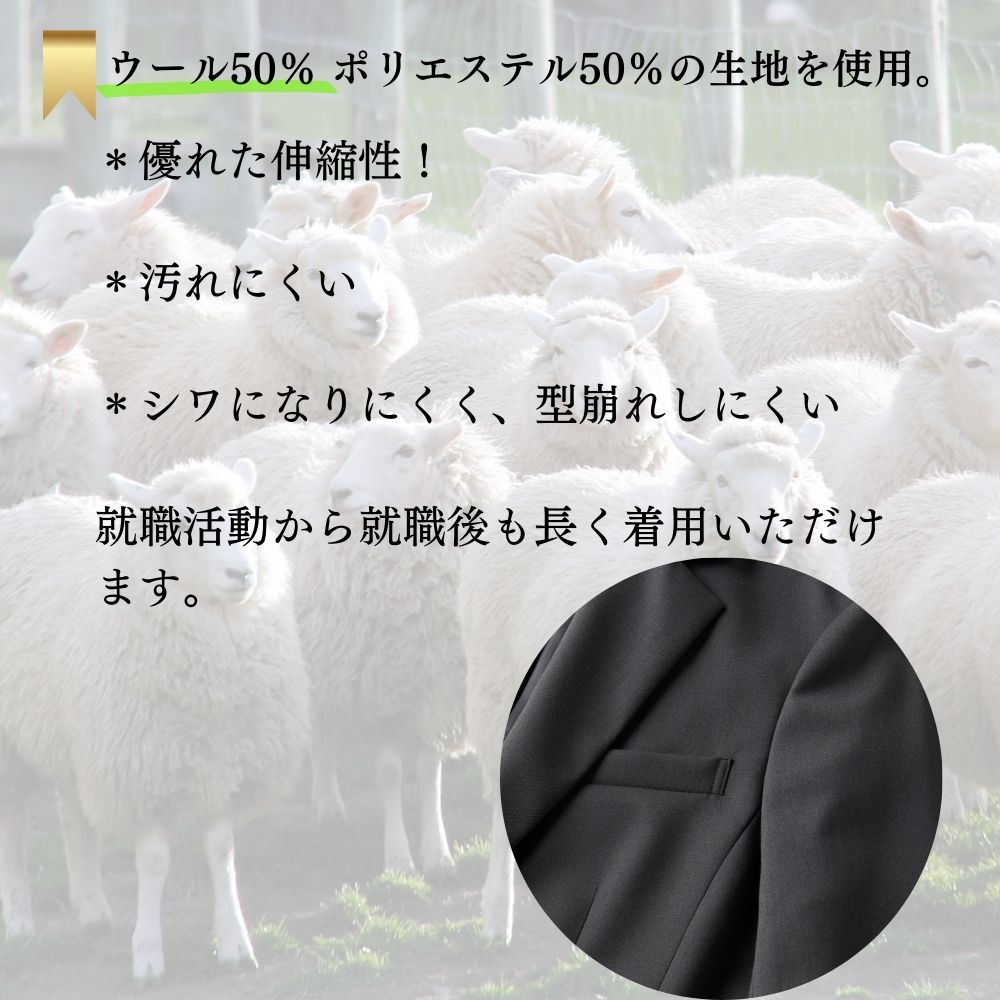 商品説明素材◆ジャケット スカート パンツ◆ 表地 毛50% ポリエステル50%裏地 ポリエステル100%注意アイロンは当て布しかけてください。中性洗剤使用、他のものと分けて洗ってください。 長時間脱水すると型崩れの原因となりアイロン掛けしてもシワが残ることがあります。 この商品は、摩擦(特に湿った状態での摩擦)や、汗や雨などで濡れたときは他の衣料や下着(特に白物)に色移りする場合がありますので十分ご注意下さい。 クリーニングの際は、多少色落ちすることがありますので、出来るだけ単品洗いをおすすめします。また他の淡色物に色移りすることがありますので、すみやかに処理(脱水・乾燥)するようお願いいたします。 汚れが落ちない場合はクリーニング店にご相談下さい。15号が追加されました!スカートスタイル、パンツスタイル、どちらも叶うリクルートスーツ 3点セット! 就職活動定番の2つ釦ジャケットにスカート、パンツのセット。 ウール混の生地で型崩れしにくく、見た目にも上質な印象を与えます。 大学の入学式から研修、就職活動まで長く着用できます。 説明会や研修には動きやすいパンツで、入学式、面接ではスカートで着回せます。 実際の商品寸法をページに載せています、スーツだと普段着られているサイズ とずれていることがあります。寸法表とお持ちのジャケット、パンツ、スカートの の寸法と比べていただけるとわかりやすいです。 サイズが合わないとやぼったい印象になってしまいます。サイズ選びの際は寸法表 ご確認いただけるようお願いします。 ◇モデル身長 169cm◇ ◇ジャケット◇ サイズ 5号 7号 9号 11号 13号 15号 着丈 56 56.5 57.1 57.6 58.1 58.6 肩幅 36.7 37 37.5 38 38.5 39.5 バスト 83.5 86.5 89.5 92.5 95.5 99.5 ウエスト 71 74 77 80 83 87 袖丈 58 58.5 59 59.5 60 60 袖巾 28.4 30.1 31.7 33.2 34.6 36.1 袖口 23 24 25 26 27 28 ◇スカート◇ サイズ 5号 7号 9号 11号 13号 15号 総丈 56 56 56 56 56 57 ウエスト 60 63 66 69 72 75.6 ヒップ 87 90 93 96 99 102 ◇パンツ◇ サイズ 5号 7号 9号 11号 13号 15号 ウエスト 68 71 74 77 80 82.8 ヒップ 89 92 95 98 101 104 股下 79 79 79 79 79 79 裾巾 19.5 20 20.5 21 21.5 23