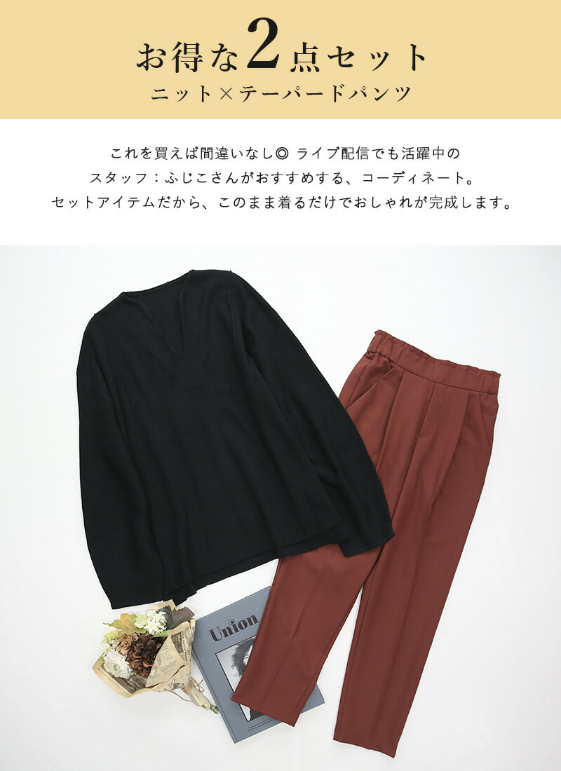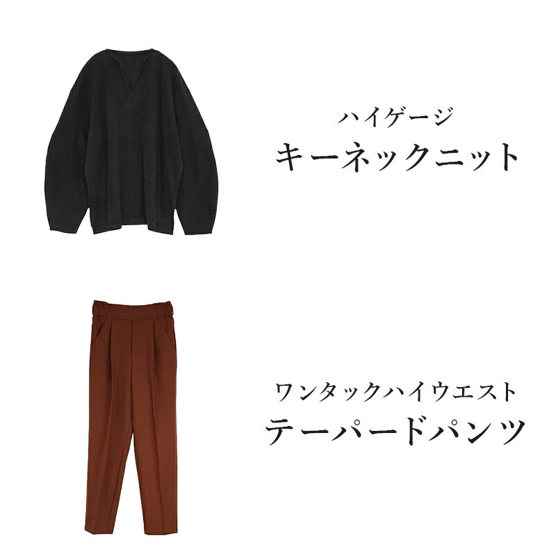 コーデセット レディース 秋のショッピングにおすすめ!パンツのサイズが選べるゆるニットスタイル【2点セット】トップス ニット キーネック 長袖 ボトムス パンツ テーパード お洒落 大人可愛い お出かけ 買い物 ブラック ブラウン S M L LL メール便不可