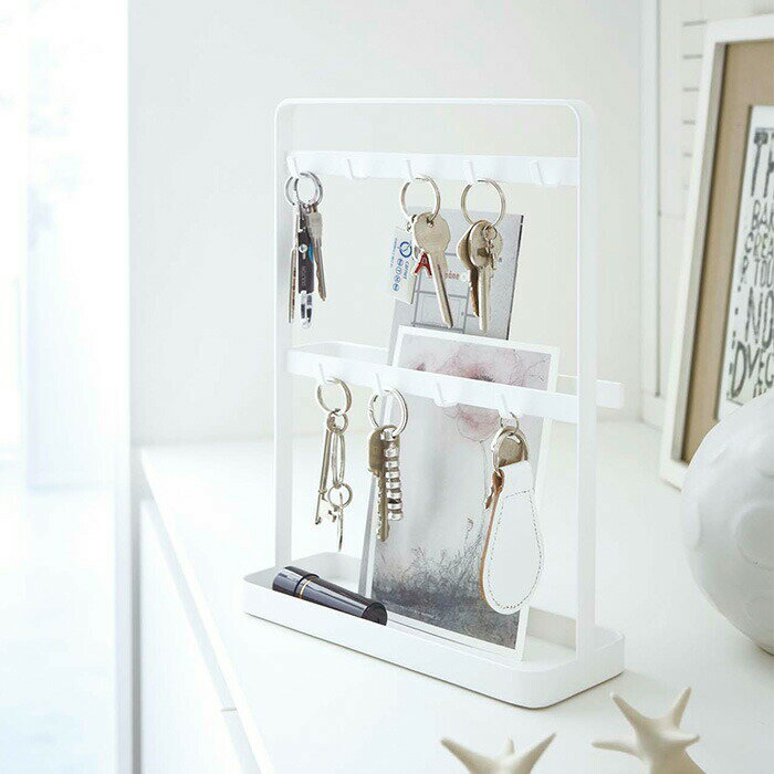 2段式のキーフックスタンド。上段に長い鍵、下段に短い鍵を掛けられます。 フックの背面にはDMや手紙などを立てられるL字バーがあります。 下のトレイに印鑑を置いておけば宅配便の受け取り時に便利です。 ●北海道・沖縄・離島は追加送料がかかります。注文確認後、送料修正しご案内いたします。smart キーフックスタンド スマート 家、車、自転車、バイクなど生活の中で使う様々な鍵。本数が増えると管理に困ることはありませんか? そんな時に便利な上下2段式のキーフックスタンドです。はがきや印鑑なども収納出来る便利なトレイ付き。奥行き7.5cmのスリムな形状だから、置き場所に困りません。玄関やリビングに、鍵の定位置を作れば管理が楽です。ご家庭はもちろん、オフィス空間にも溶け込むシンプルなデザインです。 下にトレイが付いているので、小物を収納出来ます。認め印を置いておけば宅配便の受け取り時にスムーズ。置き型なので安定感があります。 キーフックの反対面はL字バーになっています。DMや手紙などの小型の郵便物の整理にお使いいただけます。 キーフックは合計9個。段違いの2段式フックだから、長さによって使い分けられます。スリムタイプなので玄関やリビングの棚の上など、ちょっとしたスペースに置けます。 ▼ キーフックをお探しならこちらもおすすめ ▼ 「tower」のアイテムをさがす 「tosca」のアイテムをさがす 「Yamazaki/山崎実業」のアイテムをもっとさがす ●商品の詳細● 品 名 smart キーフックスタンド スマート サイズ 約 幅20 × 奥行7.5 × 高さ27cm 重 量 約 570 g 材 質 本体:スチール(粉体塗装) マット:合成ゴム カラー ホワイト / ブラック 入 数 1個 ■注意点 ※サイズをご確認の上、ご注文ください。 ※商品の色は、画像と実物とでは多少異なる場合がございます。色・イメージが違う等の理由による返品は一切お受けできません。予めご了承下さい。