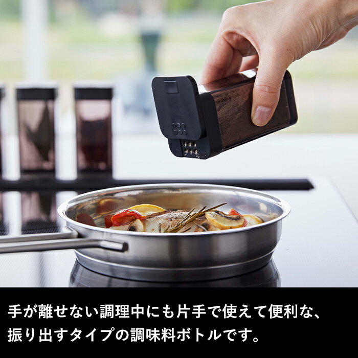 忙しい調理中でも片手で開いてふりふり。スムーズに使えて量の調節もできる調味料ボトルです。 振り出し口は2種類あり、少しずつ出したいときにも、ある程度の量を出したいときにも快適。 横並びに整頓しやすいスクエア型。スパイスの種類が増えてもキッチンをすっきりと見せてくれます。 ●北海道・沖縄・離島は追加送料がかかります。注文確認後、送料修正しご案内いたします。 JAN:4903208058254tower スパイスボトル タワー L 4個セット あわただしく調理をしているときでも、片手だけで中身を振り出すことができる調味料ボトルです。 前後にスライドするタイプの蓋だから、片手に菜箸やお玉を持ったままの状態でも開けることができ、さらに量の調節もらくらく。 2通りの口があるから、少しずつでも、ある程度の量でも、簡単に出す量を調節できます。 容量は120ml。よく使う調味料入れるのに便利なLサイズです。 スパイスボトルL単品は⇒こちら 前後にスライドする蓋で2通りの出し方ができ、片手でも好みの量に使うことができます。 少しずつ出したい塩コショウにも、ある程度の量が出てほしい顆粒だしにも、ばっちり対応できる便利なデザイン。 もたもたしていられない調理中に作業をスムーズにしてくれます。 蓋を取り外せば広く口が開き、詰め替えをしたり、お手入れの際にも洗いやすい便利な仕様です。 収納のしやすさも大きな魅力。調味料やスパイスの量が増えてもミニマルに整理できるスクエア型です。 透明なプラスチック製だから、中身が分かりやすく、落としても割れにい毎日使いにはもってこいの機能性です。 使用頻度や使用量が違う調味料でもtowerシリーズで容器を合わせればスッキリ。それぞれにあった大きさのサイズで使いやすく、見た目も統一感のあるキッチンに。 (左)小麦粉&スパイスボトル タワー>>>商品を見る (右)スパイスボトル タワー>>>商品を見る \マグネットが付けられるキッチンにはこちらもおすすめ/ 単品・4個SET >> 単品 >> 単品 >> 4個SET< 閲覧中 > 4個SET >> 単品 >> 単品 >> 2個SET >> 3個SET >> [ NEW ] 大人気のtowerなど山崎実業の最新アイテムはこちら ●商品の詳細● 品 名 tower スパイスボトル タワー L 4個SET サイズ 約 幅4.8 × 奥行き4.8 × 高さ10 cm 容 量 約 120ml 材 質 容器:アクリル樹脂蓋上下:ポリエチレン 重 量 約 90g(1つあたり) 耐冷熱 -40℃~90℃ カラー ホワイト/ブラック 入 数 1セット/4個入り 備 考 インデックスシール付属 ■注意点 ※食器洗い乾燥機・電子レンジ・冷凍庫にはご使用いただけません。 ※熱湯、アルコール消毒、漂白剤、水へのつけ置きはお避け下さい。 ※完全密封するものではありません。 ※ご使用前に中性洗剤などで洗って、水分をしっかりとふき取り、十分に乾燥させてからご使用ください。 ※製品の蓋をもって持ち上げないでください。 ※アルコール類、強い酸性、アルカリ性を多量に含む液体の保存はお避け下さい。 ※レモン等の柑橘類の皮に含まれるテルペンまたは油脂によって変質することがあります。 ※直射日光や火が直接当たる場所や高温になる場所では使用しないでください。 ※商品の色は、画面上の画像と実物とでは多少異なる場合がございます。色・イメージが違う等の理由による返品は一切お受けできません。予めご了承ください。