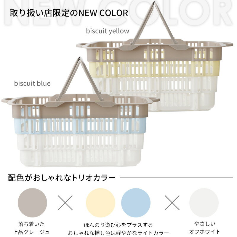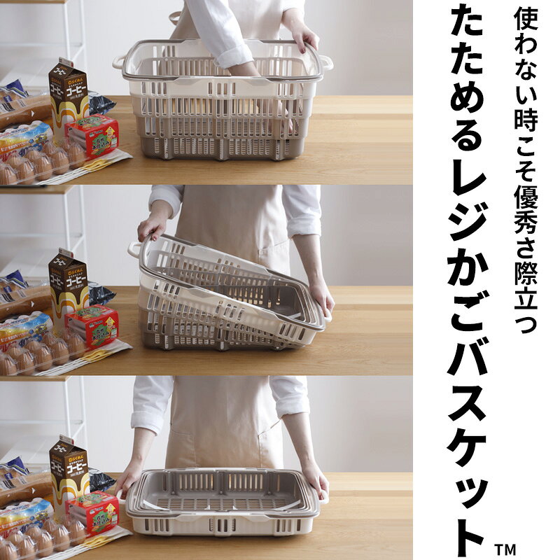 収納やお買い物時のエコバッグとして活躍してくれる、便利な「 たためるレジかごバスケット™ 」 折りたためるから使わない時も置き場に困りません。 ●沖縄・離島は追加送料がかかります。注文確認後、送料修正しご案内いたします。たためるレジかごバスケット™ 使わない時や持ち運び時に便利「 たためるレジかごバスケット™ 」 ご家庭での収納やアウトドアでの荷物の持ち出し、お買い物のエコバッグ代わりのマイバスケットとして便利に使えます。 取り扱いやすい軽量設計ながら2Lペットボトル9本収納可能。 一般的なレジカゴと同等のサイズ感でたたむと約7.9cmと超コンパクトになり使わない時に邪魔になりません。 あると便利だけれど、使わない時にその大きさが収納に悩むレジかご。 そんなお悩みを解決する「たためる」レジかごバスケット。 ベルトを使った簡単な組み立て・分解で使わない時はコンパクトに収納できる便利なバスケットです。 お買い物時にマイバスケットとして使用すれば、お会計後のエコバッグへの詰め替えをまるっと省略。 効率的な時短になり、また底のあるバスケットなので形が不安定な袋だと卵やパン・お野菜など潰れてしまわないよう気を使うものも安心して入れる事ができます。 たたんだ状態の厚さは約7.9cm。 隙間に立てて収納したり、お買い物用に車の中に置きっぱなしもできる邪魔にならないコンパクトさです。 持ち手はたたむときパチッと本体に固定できるのでぶらぶらせず安定感抜群。 両サイドについたハンドルでたたんだ状態での持ち運びも快適です。 あれもこれもたっぷり入る容量約30.1L。 一般的なレジかごと同等のサイズで、レジかごと同じ感覚でご使用いただけます。 そのままショッピングカートにのせたり、持ち手を手荷物フックに引っ掛ける事もできます。 お買い物に便利なBAG マーナ Shupatto コンパクトバッグ S / M / L マーナ Shupatto パッカブルバッグ 8L/27L tower コンビニちょい買い保冷&保温バッグ タワー ⇒ 商品カテゴリー>エコバッグ ⇒ tower「洗えるお弁当バッグ タワー」 ●商品の詳細● 商品名 たためるレジかごバスケット™ サイズ 約 570 × 361 × 237mm折りたたみ時高さ 約79mm 容 量 約 30.1L 耐荷重 約 18kg 材 質 PP 重 量 約 800g カラー カフェラテ/シナモンブラウン/ホワイトグレー/フローズンホワイト/ストーングレー/ビスケットイエロー/ビスケットブルー 入 数 1個 備 考 日本製 ■注意点 ※カゴがしっかり組み立てられていることを確認してからご使用ください。組み立てが不十分ですとたたんだ状態に戻ることがあります。 ※組み立て時、構造上真上からの力には対応できません。組み立てた状態でカゴ自体を上から押しつぶすような力のかけかたはしないでください。 ※折り畳み時は必ずベルトの固定箇所を外したのちに畳んで下さい。 ※重いものを運ぶ場合は状況に応じて底部を持つようにしてください。 ※商品の色は、画面上の画像と実物とでは多少異なる場合がございます。色・イメージが違う等の理由による返品は一切お受けできません。予めご了承ください。