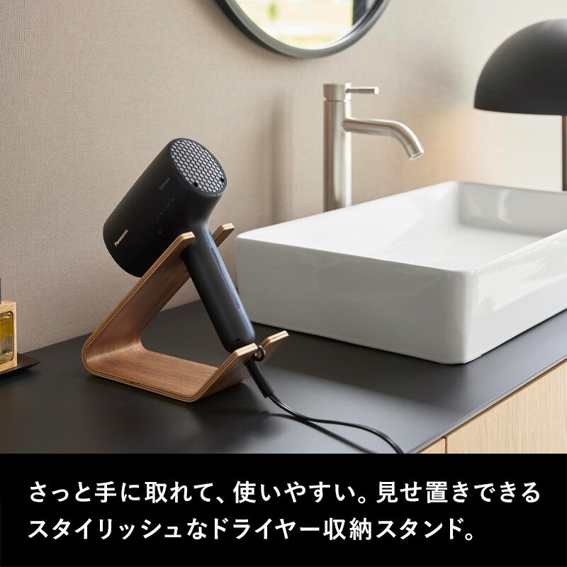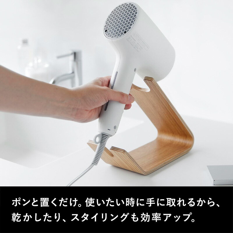 上品な佇まいで、空間に溶け込むおしゃれなドライヤー・ヘアアイロンの収納スタンド。 さっと置くだけの収納で、使いやすく、仕舞いやすい。 始めと終わりの使い勝手のよさが向上するだけでなく、使用中もハンズフリーで使える利便性のよさも兼ね備えています。 毎日の習慣をちょっと快適にするおすすめのアイテムです。 ●北海道・沖縄・離島は追加送料がかかります。注文確認後、送料修正しご案内いたします。 この商品はラッピング可能です。(+110円)ご希望の方は[ラッピングする]を選択のうえ、ご注文ください。 JAN:4903208013321RIN ドライヤー&ヘアーアイロンスタンド リン 上品な木目のカーブが映える、おしゃれなドライヤー&ヘアーアイロンスタンド。 お使いのドライヤーやヘアーアイロンをスタンドにポンと置くだけ。隠す・しまうではなく、見せる収納にすることで、サッと手に取れて使い勝手がよくなります。 ドライヤーならハンズフリーで使える便利な仕様も嬉しいポイント。両手が使えるからブラシを使ったスタイリング、ブローがいつもより快適になりそうです。 上品な佇まいがインテリアに映えるおしゃれな収納スタンド お風呂あがり、朝の身支度に、毎日使うドライヤーやヘアーアイロンを使いやすく収納できる専用スタンド。 スタンドに立てかけて置くだけで、使いたいときにさっと使える。毎日のことだから、効率よくスタートできれば時短にもつながりそうです。 天然木を使用し、木ならではのあたたかみを演出。上品な佇まいで、出しっぱなしでもさりげなく空間に溶け込みます。 ハンズフリーでブローを快適に スタンドにドライヤーを乗せて、ハンズフリーで使える嬉しい仕様に。髪をとかしながら、タオルドライしながら、両手が使えるからブローがしやすくなります。 ※使用中は熱くなる先端を下向きにして収納しないでください。必ず上向きでご使用ください。 〇マグネットドライヤー&コードホルダー タワー 〇石こうボード壁対応ウォールドライヤーホルダー タワー 〇棚下ドライヤーホルダー タワー ⇒ 商品カテゴリー>ドライヤー収納 ⇒ RINで揃える洗面所収納 ⇒ ヘアドライの時短に「マーナ ふんわりドライターバン」 [ NEW ] 大人気のtowerなど山崎実業の最新アイテムはこちら ●商品の詳細● 品 名 RIN ドライヤー&ヘアーアイロンスタンド リン サイズ 約 幅 8.5 × 奥行き 21.7 × 高さ 17.1cm (内寸 ホルダー部/上側:約 幅 4.5 × 高さ 4.5cm、下側:約 幅 2 × 高さ 3.4cm、上下ホルダー部の間隔:約 12.2cm) 耐荷重 約 1kg(静止荷重) 材 質 天然木積層合板(ウレタン樹脂塗装) 重 量 約 180g カラー ブラウン/ナチュラル 入 数 1個 ■注意点 ※天然木の性質上、色、柄など異なる場合があります。 ※ドライヤー・ヘアーアイロンのサイズや形状、表面仕上げ、その他仕様によっては収納できない物もあります。 ※電源プラグを差し込んだまま収納しないでください。 ※使用中または使用直後の熱くなったドライヤー・ヘアーアイロンは収納しないでください。 ※不安定な場所を避け、平らな場所に設置してください。 ※お使いになるドライヤー・ヘアーアイロンの取扱説明書をよく読んでご使用ください。 ※耐荷重を超える使い方はしないでください。 ※直射日光の当たる場所や、高温・多湿の場所、火の近くで使用しないでください。また、冷暖房器具の熱や風が直接当たる場所には設置しないでください。 ※商品の色は、画面上の画像と実物とでは多少異なる場合がございます。色・イメージが違う等の理由による返品は一切お受けできません。予めご了承ください。