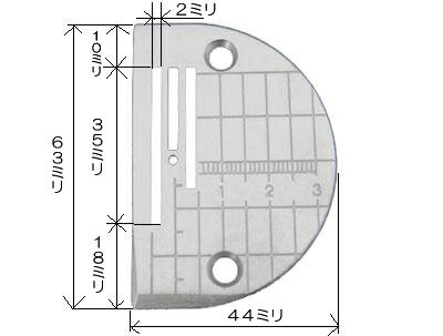 針板に1mm単位でメモリ(ゲージ/数字)が刻んであるためステッチ縫いの時など便利なメモリ付き針板です。 針板にメモリが刻印してあるため消えることもありません。 針板には、送り歯の溝が3ヶ所のタイプと4ヶ所のタイプがあります。 写真の針板は、3枚送り歯(送り歯が3列になっています)のタイプです。 また、針穴の大きさも4種類あります。 薄地用(針穴 直径 1.4ミリ) 中厚物用(針穴 直径 1.6ミリ) 厚物用(針穴 直径 2.0ミリ) 極厚物用(針穴 直径 2.2ミリ) 超極厚物用(針穴 直径 2.4ミリ) 4枚送り歯用の針板は「針穴 2.0ミリ・2.2ミリ・2.4ミリ」は製造されていません。 寸法: 63*44ミリ 厚み 2.6ミリ 針板の製造メーカー:SUNAFF この針板は、針板の形状が半円型の針板を採用しているミシン(工業用ミシン)しか取付けることができません。 半円型の針板を使用している工業用ミシンでも、今ご使用の針板の裏側に「SUNAFF」と刻印があれば同じように使用できますが、刻印がない違うメーカーの針板をご使用の場合は送り歯の高さ調整や前後位置調整が必要になる場合があります。 針板の形状が四角い職業用ミシンには、取付けることができませんのでご注意ください。 また、半円型の針板を採用していた古いミシン(足踏みミシンなど)や一部の半円型の針板を採用している職業用ミシン(ジャノメ コスチューラなど)にも取り付ける事が出来ますが、ミシンについている針板と針板の厚みがあるため、送り歯が針板の表面より上側に出ないため、生地が進まない・進みが悪くなる場合があります。進みが悪くなった場合は、送り歯の高さをあげていただく(調整方法はお持ち のミシンの説明書をご確認ください)か送り歯を止めている2ヶ所のネジを緩めて送り歯と送り歯を止めている土台の間に厚紙を挟んで送り歯の高さを上げてください。 注意 取り付けた状態の写真に掲載している押え・針板止めネジ・送り歯は代金には含まれていません。