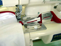 ベビーロック ふらっとろっく・ベビーロック Kanade(BLC-7J)・ジャノメ トルネィオ・工業用平ミシン(ニット用ミシン)などの カバーステッチミシンに取り付ける事の出来るニット用の四つ折りバインダー(ニッポー製)です。 バインダーの型番:NB−4B このバインダーを使用すると、テープを四つ折にして、端にすばやく簡単に縫い付けることが出来ます。 折ったテープの間に身頃の生地を挟まずに縫うことも出来るため、キャミソールの紐作りとしても使用できます。 縫い仕様の画像は針1本で縫ってありますが、2本針または3本針でも縫うことが出来ます。 仕上がり寸法が幅広の場合は2本針3本針で縫うことが多いですが、仕上がり寸法が10ミリくらいの場合は 通常は1本針で縫うことが多いです。 その他のサイズの、ニッポー ニット用三つ折バインダーは、下記のアドレスに掲載しています。 https://item.rakuten.co.jp/andomishin/c/0000000337/ その他のサイズの、ニッポー ニット用四つ折バインダーは、下記のアドレスに掲載しています。 https://item.rakuten.co.jp/andomishin/c/0000000338/