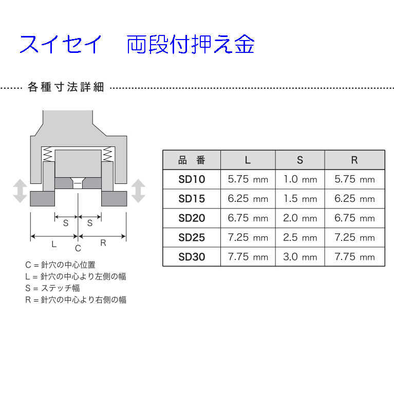 段付押えを使用してミシン作業を行うと安定した幅でステッチ縫い作業をすることが出来ます。 この両段付き押え金は、1つの押え金に左右2つのガイドがついています。 大量に商品を縫う場合は、片側のみついている段付押え金がおすすめです。 ● スイセイ 両段付き押え金(1.0ミリ) 型番:SD10 押えの前後長さ: 28ミリ 製造会社:卓輝工業(ブランド名:スイセイ/SUISEI) *日本製 注意 ステッチ押え(段付き押え)は、寸法によって押え金を交換する必要があります。 この商品は、職業用ミシン・工業用ミシン(一部の特殊ミシンを除く)用の商品になります。 家庭用ミシンには、取り付けることが出来ませんのでご注意ください。 その他の寸法の「スイセイ 両段付き押え金」は、下記のアドレスに掲載しています。 https://item.rakuten.co.jp/andomishin/c/0000000443/ その他のメーカー・形状の段付押え(ステッチ押え)は、下記のアドレスに掲載しています。 https://item.rakuten.co.jp/andomishin/c/0000000229/