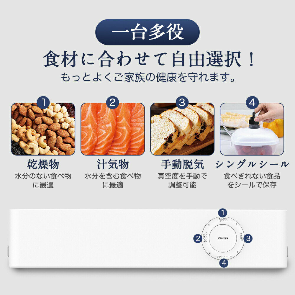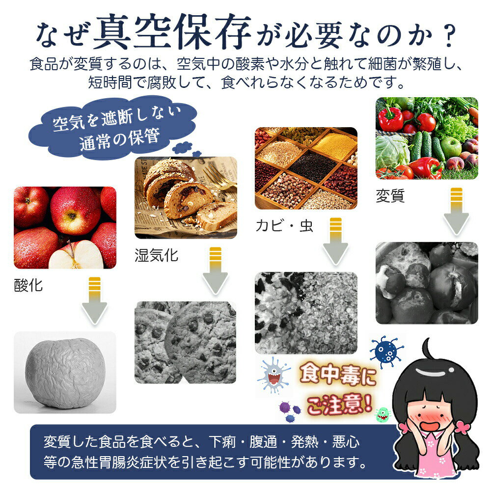 製品名真空パック機おすすめポイント●【湿式?乾式両用】 弊社の真空パック器は、食材の酸化などの劣化現象を遅らせることで、長期の冷蔵保存を可能とします。また、真空状態で冷凍した場合、冷凍にかかる時間が短くなり、水分と一緒に旨みが出てしまう現象を防止可能。食材の鮮度や料理のおいしさが長持ちするので、作り置きを多くする方におすすめです。乾性、湿性食品はもちろん、パウダー、壊れやすい食品にも対応可能です。また、操作が簡単です、袋をセットしてボタンを押すと、脱気からシールまで自動で行うので、はじめて使う人でも簡単にパックできます。時間が経過しても空気が入りにくいのも特徴です。 ●【80Kpa----スーパーパワー】 ボルテックスサイクロン技術を採用し、吸引力の向上と吸引ロスの低減を実現した真空機です。吸引力は従来の第3世代より大幅に向上し、気流量は8L/minで、8〜20秒で効率よく真空にすることが可能です。 また、この真空パック器は開発時に2000回以上のテストを行い、吸引力が強すぎると食品の変形や壊れやすい食品が潰れたり、吸引力が弱すぎると空気の残留や細菌の繁殖、鮮度の低下などが起こるため、優れた吸引力と鮮度を実現する80kpaの設計になっています。 ●【30cmの密封長さ&鮮度が長持ち】 30cmの熱線は大容積の食品に最適であるだけでなく、複数のバッグを同時に真空パックすることも可能にします。真空パックでは通常保存より雑菌の増殖を約1/50に抑制することができ、雑菌や酸化による食材の変質?劣化を防ぐことができます。賞味期限も大幅に延長できるようになり、ご家族の健康もお守りします。 ●【特別なシールのみ機能と脱気機能】 食べきれなかったお菓子はもう一度密封することができ、、開封したスナックは一度に食べる必要はありません、8-20S高速的にシールすることができます。濡れた食品は、真空シールの過程で、液体が袋の口のヒートシールラインに気流で送られ、真空効果に影響を与える、シールのみ機能を使用して、この問題を解決することができます。 また、手動吸引機能が搭載されているところも魅力的。柔らかい食材でも調整しながら、真空状態にしていくことが可能です。 ●【お手入れ簡単】 真空後温度が下がったら、水槽を取り外し可能で、使用後、水の流れできれいにお手入れ可能です。 ●【低騒音&操作簡単】 作動音は65dB以下です。低騒音なので、ご家族の安眠を邪魔しません。ワンタッチで迅速に脱気し、真空保存の効果を達成することができます。ボタンをタッチすると、LEDランプの状態によって作業の進行を把握できます。 ●【使用上のご注意】※※※初めて使用する前、サポートブロックを取り出してください。両手で両端を「カチッ」と音するまでしっかり蓋を押してください。※※※吸引&密封する場合は、必ず真空パック専用袋(表面凹凸エンボス加工)を使用してください。一般のポリエチレン袋では空気の吸引はできません。※※※真空パックできない場合は、下記の内容をチェックしてください。袋の開口部を真空溝真ん中の上に置いて、溝を超えないください。脱気口を覆わないでください。 ※※※ご使用の前に必ず本書「取扱説明書」をよくお読みください。説明書に記載している通り、作業終わったら、ロックせずに保管してください。ロックして保管した場合、スポンジを圧縮され、圧着不良の原因となります。 ※※※汁物は冷凍して固まってから真空パックしてください。 【アフターサービス】商品の管理に最善を尽くしておりますが、万が一何かありましたら、お気軽に弊店までご連絡いただけますようにお願いします。ご心配なく、返品まだ返金処理でご対応することが可能でございます。 メーカー希望小売価格はメーカーサイトに基づいて掲載していますメーカー希望小売価格はメーカーサイトに基づいて掲載しています