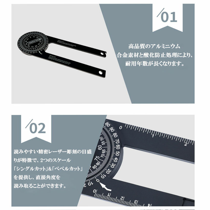 【多機能測定】: マイターソー分度器は360°回転でき、様々な角度で測定できます。 様々な機器やシーンに適しています。 すべてのニーズを満たすため、内部と外部両方の角度を正確に測定できます。【正確なスケール】: 製品の表面のスケールはレーザー刻印されており、その値はクリアで正確で、ほとんどエラーはありません。 黒 分度器 と 白 目盛 は、光が無くても簡単に値が読み取れます。【幅広い用途】: マイターソー分度器は便利で、シンプルで簡単に使用できます。 プロであろうとも、この製品を使用すると、作業に非常に便利になります。 木材、パイプ、金属の加工やモデリングに非常に適しています。【堅牢で耐摩耗】: 本製品はアルミ合金素材で作られており、丈夫で厚手、耐久性、防水性、変形しにくく、レーザー刻印値、クリアで耐摩耗性、錆びにくく、高品質です。【持ち運び便利】: 本製品は小型で軽量、収納に場所をとりません。 ツールボックスや洋服のポケットに収納でき、持ち運びにとても便利です。
