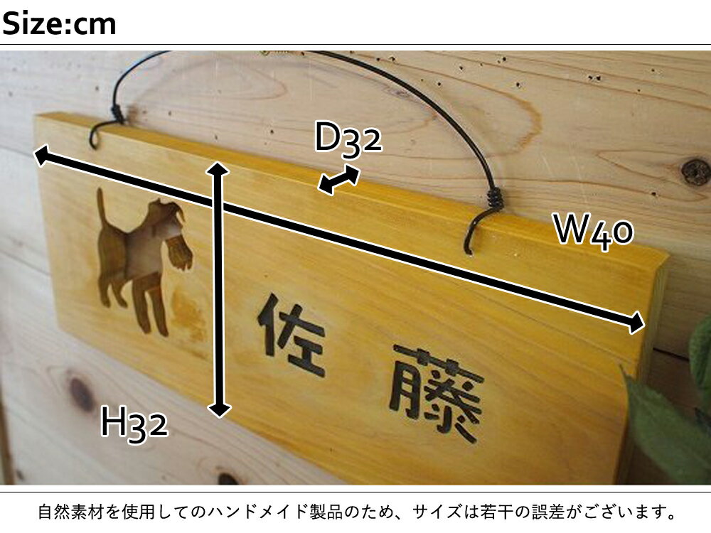 ネームプレート ウェルシュ・テリア くり抜き 文字こげ茶色 吊下げワイヤー 35.5×2×14cm ナチュラル 木製 ひのき ハンドメイド オーダーメイド