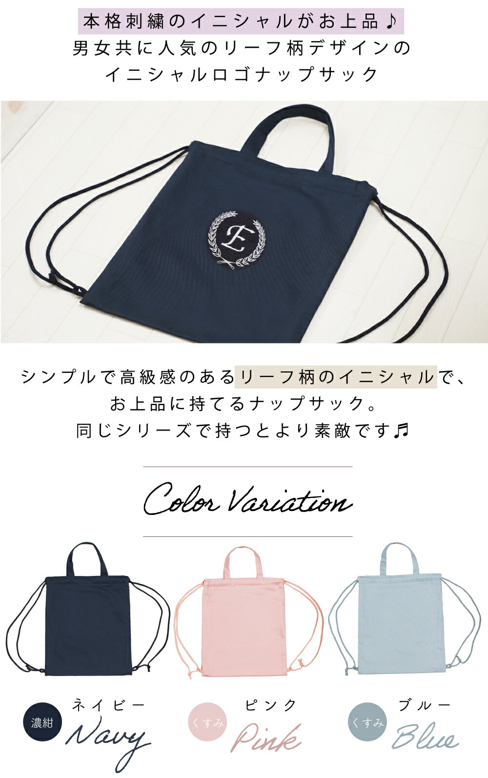 名入れ 刺繍 ナップサック 幼稚園 小学校 新生活 体操服入れ 人気 男子 女子 ネイビー ピンク ブルー 男の子 女の子 上履き入れ 上靴 シンプル 名前 無地 上品 イニシャル 刺繍 お受験 進学 入学 お祝い 入学祝 受験 リーフ柄