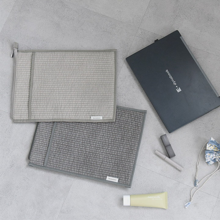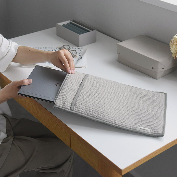 【ご希望の商品が売り切れの場合】「お問い合せ」リンクより、ご希望の「サイズ」「カラー」をご記入の上、「お知らせメール希望!」と送信してください。(取扱い終了などの場合もございます。)すっきりスリムな ヌビ風 PCケース パソコンケース/PCケース 13.3 PCケース13 PCケース おしゃれ ノートパソコン 13.3 ノートパソコンケース シンプル ノートpc ケース カバー パソコンケース/bon moment ボンモマン【ネコポス対応】商品詳細バッグの中でかさ張らないヌビ風素材のノートPCケースが登場。ふっくらとした中綿入りでクッション性もありながら、バッグの中を圧迫しないスリムさも魅力です。SPEC◆size外寸/約縦35×横27×厚さ1.2cm内寸/約縦33×横24cm外ポケット/縦29×横24.5cm重さ:約150g◆素材本体/綿100%裏地・中綿/ポリエステル100%※推奨PCサイズ:13.3インチ※収容可能PCサイズ(最大):縦33×横21.5×厚さ1.8cm原産国/製造国 :中国知っておいて頂きたいこと※商品写真は撮影条件により、実際のカラーと異なる場合がございます。実物に近いカラーに関しては、カラーバリエーション枠(カート横の商品画像)をご確認ください。※本来の目的以外で使用しないでください。※容量以上のものを詰め込んだり、極めて重いもの、先の尖ったものを入れて使用しないでください。※無理な力や衝撃を与えたり、分解などしたりしないでください。※火気の近くや高温の場所で使用・保管はしないでください。※濡れ、摩擦、汗、日焼け等により、色落ち、変色することがありますので、ご注意ください。※本製品は衝撃を完全に防ぐものではありませんので、タブレットやパソコン等の機械類を入れる際にはお取り扱いに十分にご注意ください。※ご使用のタブレットやパソコンのサイズによって、本品がご使用いただけない場合があります。必ずサイズをご確認のうえご使用ください。お手入れ方法洗濯弱又は手洗い40℃までアイロン底面110℃までドライNG漂白NG色落ち注意タンブル乾燥NG日陰つり干し洗濯ネット使用すっきりスリムな ヌビ風 PCケース パソコンケース/PCケース 13.3 PCケース13 PCケース おしゃれ ノートパソコン 13.3 ノートパソコンケース シンプル ノートpc ケース カバー パソコンケース/bon moment ボンモマン【ネコポス対応】バッグの中でかさ張らないヌビ風素材のPCケースカバンにすっきり入る、スリムなシルエット。お仕事使いしやすいシンプルさなのに、カバンから出した瞬間気分を上げてくれる、ヌビ風素材のノートPCケースが登場しました。ふっくらとした中綿入りでクッション性もありながら、バッグの中を圧迫しないスリムさ。ウォッシュ加工を施したヴィンテージ感のあるルックスが大人のオフィススタイルにも馴染みます。朝から晩まで忙しい時も、お気に入りのツールがあるだけで気持ちがちょっぴり上向く。忙しい毎日に寄り添ってくれるPCケースです。通勤バッグにすっきり収まる「スリムヌビ」シンプル無地のデザインノートPCケースはカバンの中に入れて持ち歩きたい、という方にぴったりなすっきりタイプ。装飾なしのシンプルデザインでかさばりにくく、荷物の多い1日でも持ち運びやすい一品です。カバンを圧迫しないサイズ感13.3インチまでのPCやタブレットがぴったり入るサイズ感。スリムな形でカバンの中を圧迫せずにすっきり持ち歩けます。くたっと表情感を楽しむ“ヴィンテージ感”「ヌビ」は韓国伝統のキルティング生地。布と布の間に綿(わた)を挟み入れ、合わせながら一針一針、一定の間隔で縫い合わせるキルティング生地のことを言います。生地表面に立体的な凸凹のある素材感が特徴です。ナチュラルな印象のヌビ風素材ですが、こちらはウォッシュ加工をかけることでほんのり杢調の風合い。ヴィンテージ感のある雰囲気に仕上げています。ふんわり綿でもスリムを実現ふっくらしすぎず適度な厚みの中綿でクッション性とスリムさを両立。ふんわりとした素材感ですがパイピング加工をすることで、メリハリのある見た目に仕上げています。マウス&充電器もすっぽり外側ポケットケーブルやマウスをまとめて入れられる外側ポケット付き。ポケット口が大きく、深さも十分にあるのでそのままサっと入れられます。ポケット口にはマグネットボタンが付いているから中身が飛び出しにくく安心。A4ファイルや書類などを入れるのも◎です。洗濯機にポンッでお手入れ楽ちん汚れたらネットに入れて洗濯機で丸洗いOK。お手入れも簡単だからいつも清潔な状態で使えます。オフィスにも馴染むシンプル2カラーくたっと表情のある素材で遊び心を添えられた、オフィス&お家にも馴染むシンプルカラー。bon momentで展開中のヌビ風バニティやバッグと色を揃えています。ライトグレーは内側がイエローベージュ、チャコールグレーは内側がブルーグレーとさりげない配色に。ライトグレー優しい雰囲気のライトグレー。やや杢調で品のあるカラーです。チャコールよりヴィンテージ感のあるチャコ