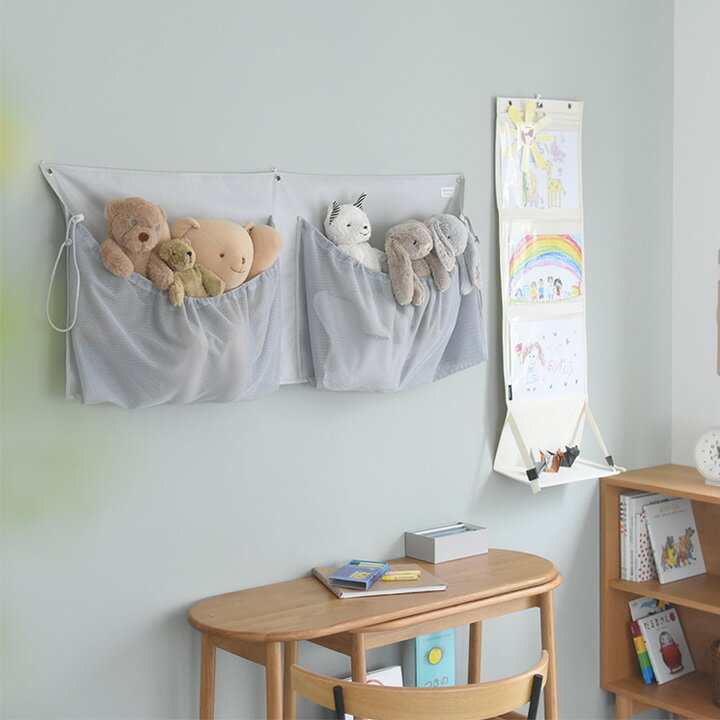 【ご希望の商品が売り切れの場合】「お問い合せ」リンクより、ご希望の「サイズ」「カラー」をご記入の上、「お知らせメール希望!」と送信してください。(取扱い終了などの場合もございます。)【今だけ10%OFF】デッドスペースに収納 ぬいぐるみ ウォールポケット/ぬいぐるみ 収納 おもちゃ 収納 ぬいぐるみ ディスプレイ 収納 ウォールポケット ぬいぐるみ ウォールポケット 壁掛け ウォールポケット おしゃれ ハンモック 収納 シンプル 北欧/kukka ja puu クッカヤプー商品詳細増えたぬいぐるみを収納するウォールポケット。ベッド上などのデッドスペースを活用しつつ様々な大きさのぬいぐるみを収納できます。程よく目隠ししつつ中が見えるのも◎。SPECsize:本体/約縦48×横120cmメッシュポケット/約縦38×横55cm ×2重さ:約445g素材:ポリエステル原産国/製造国 :中国知っておいて頂きたいこと※商品写真は撮影条件により、実際のカラーと異なる場合がございます。実物に近いカラーに関しては、カラーバリエーション枠(カート横の商品画像)をご確認ください。※本来の用途以外のご使用はしないでください。※過度に重いものや鋭利な形状のものを入れたり、無理な詰め込みをしたりすると破損の原因になりますのでご注意ください。※洗濯はしないでください。破損・型くずれ等の原因となります。※火気の近くや高温の場所で使用・保管はしないでください。※汚れた場合は乾いた布で優しく拭き取ってください。※シンナーやベンジン類などの有機性の溶剤、漂白剤は生地の色落ちや変色などの原因になりますので、使用しないでください。※吊り下げパーツの付属はありません。取り付けの際は、市販のブッシュピン・ ピンフックなどをご使用ください。※プッシュピン・ピンフックは耐荷重800g〜1kg以上のものを推奨いたします。【今だけ10%OFF】デッドスペースに収納 ぬいぐるみ ウォールポケット/ぬいぐるみ 収納 おもちゃ 収納 ぬいぐるみ ディスプレイ 収納 ウォールポケット ぬいぐるみ ウォールポケット 壁掛け ウォールポケット おしゃれ ハンモック 収納 シンプル 北欧/kukka ja puu クッカヤプー壁にお家をセッティング!ぬいぐるみたち大集合お散歩に行く時も寝る時だってず〜っと一緒、子どもたちのお友だちであるぬいぐるみ。大切な存在ではあるけれど、いつのまにか爆増して収納場所に頭を悩ませることも、、、。そんな状況をレスキューする、“壁に吊り下げられる収納”が完成しました。ベッド上などのデッドスペースを活用しつつ、様々な大きさのぬいぐるみがギュッと大集合。程よく隠しつつ中が見えるから「あの子は!?」と急に心配になるキッズたちも安心、ママのお悩みも解決しそうです。増えた「ぬいぐるみ」たち、どうしよう…POINT1 : デッドスペースに吊り下げられるウォールポケット感覚でベッド上を活用お部屋の中のデッドスペースに吊り下げられる、こちらのぬいぐるみ収納。箱やボックスだと場所を取る、そんな時にも便利です。一般的なベッド幅に収まりやすいよう、横幅は120cmにしました。お部屋の角にL字に吊るすこともできます。幅が足りないかも、そんな時にも◎。※L字に吊るす場合は、中央部分の収納量に多少の影響がありますので、ご了承ください。POINT2 : ポンポン入れるだけで簡単キッズでも楽ちんお片付け2つの大きなポケットにぬいぐるみをポンポン入れるだけ、収納も簡単です。“ぬいぐるみのお家”のような感覚で楽しくお片付けができそう。ポケットの入り口には巾着紐が付いていて、様々なサイズのぬいぐるみにフィット。巾着を絞った状態でも出し入れはできますが、緩めた状態の方がスムーズにできます。POINT3 : 隠しながらも“見せる収納”メッシュポケットで程よく目隠しぬいぐるみの収納部分には、メッシュ素材を使用しています。中に何が入っているかは分かるけれど、程よく目隠しされているからお部屋をスッキリ見せてくれる効果も。本体裏側はPVC加工を施したハリ感のある素材です。しっかりとした生地感でへたりにくいのもポイント。これくらいのサイズ&量が入ります壁への設置方法左右両端、中央にハトメをフックなどに掛けてご使用ください。※吊り下げパーツの付属はありません。市販のプッシュピン・ピンフックなどをご準備下さい。※プッシュピン・ピンフックは耐荷重800g〜1kg以上のものを推奨いたします。中身を入れたら、収納量に合わせて左右の巾着紐を引っ張り、ストッパーで固定してご使用ください。 日々のコラム:『増え続けるぬいぐるみ問題』に、目からウロコの収納スペース発見!インスタグラマーさんも活用中の新収納とは?テーマパークのお土産として買ったり、プレゼントで貰ったり。子どもとの暮らしでいつの間にか増えていくぬいぐるみ。おもちゃ箱にも入り切らず、リビング…このコラムを見る関連商品はコチラ作品 収納 ファイル 作品 収納 ケース2970 円【Lサイズ 】 がばっと開いて見やすい 2970 円【Sサ