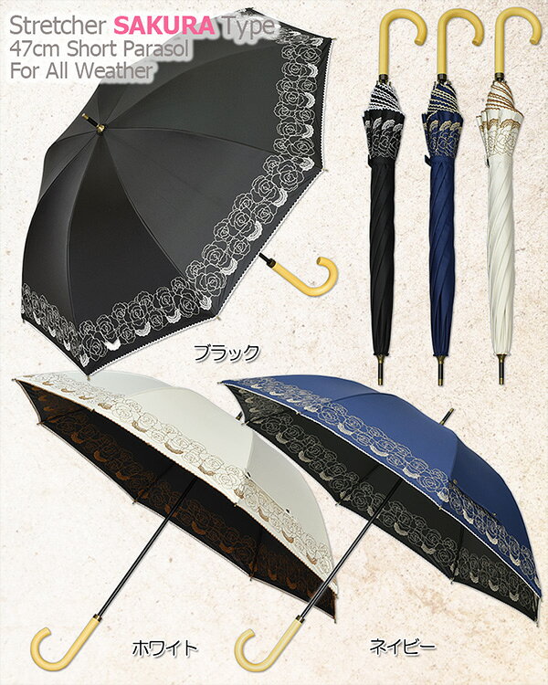 桜骨の傘【レディース晴雨兼用長傘 UVカット率99%以上 遮光率99%以上】ローズボーダー刺繍 47cmサクラ受骨/ショート手開き傘《UVブラックコーティング グラスファイバー骨》涼しい かわいい プレゼント 無料ラッピング 母の日 義理の母 送料無料