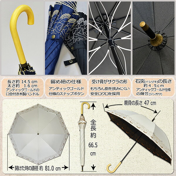 Size&Materials 親骨の長さ 47cm×8駒 骨の素材 親 骨:グラスファイバー 受け骨:グラスファイバー 中 棒:スチール *傘の構造図解はコチラ タ イ プ 手開き 素 材 ポリエステル100% 全 長 約66.5cm 傘を開いた時の直径 約81.0cm ハンドルの長さハンドルの太さ 約14.5cm約1.6cm 留め紐の仕様 スナップボタン 重 さ 約265g 生産国 中 国 Design & Pattern ▼画像をクリックすると拡大します ブラック ネイビー ホワイト 全長約14.5cm/太さ約1.6cmの木製ハンドル。アンティックゴールドの口金付き木製ハンドル 留め紐はアンティックゴールド仕様のスナップボタン 開閉の際にも指を挟みにくい安全ロクロを採用。安心です *安全ロクロの取り扱い方法はコチラ 石突(イシヅキ)の長さは約4.5cm。アンティックゴールド仕様の陣笠 (ジンガサ)がカッコよろし傘を開くとサクラの花が咲いたようなキュートな晴雨兼用日傘です 生地に防水加工とブラックコーティング加工(ポリウレタン加工)を施し、紫外線カット率99%以上を確保。 コンパクトで取り扱いやすい47cmサイズショートタイプの晴雨兼用日傘です。 個性的でオシャレな傘をお探しの方におススメです! ■生地裏面に特殊コーティング加工を施し、紫外線を99%以上カット♪(反物の段階での数値測定) ■太陽光についても99%以上(遮光率)カット♪(反物の段階での数値測定) ■傘内の温度上昇を約2/3に軽減する遮熱効果アリ♪(当社製品比較での数値測定) ■晴雨兼用なので急な雨でも安心です (※注)生地には防水加工を施していますが刺繍部分から雨が漏れる可能性があります ■親骨・受け骨ともにグラスファイバーを使用し重さは約265g ■開けた直径は約81cm・全長は約66.5cm。小さめサイズのコンパクトスタイル ■全長約14.5cm/太さ約1.6cmのハンドルは木製。アンティックゴールドの口金付き ■留め紐はアンティックゴールド仕様のスナップボタン ■石突(イシヅキ)の長さは約4.5cm。陣笠(ジンガサ)もアンティックゴールド仕様 ■受け骨がサクラの形。もちろん指を挟みにくい安全ロクロを採用 *安全ロクロの取り扱い方法はコチラ 遮蔽・遮光・遮熱のトリプル効果! ■ 太陽からの紫外線を99%以上カットします ■ 太陽光を99%以上(遮光率)カットします ■ 傘内の温度上昇を約2/3に軽減(当社比)します ■ 当店にて使用しておりますUVブラックコーティング生地につきまして、Qtec(キューテック)《(財)日本繊維製品品質技術センター》による検査の結果、 未加工生地を使用した当社製品との比較で35%以上の遮熱効果が認められました ■ 検査結果や検査方法についての詳細は *コチラ* * 検査時の環境は実際にお使い頂く環境とは異なるため、体感温度が削減することを保障するものではございません ← 画像をクリックして頂くと別ウィンドウにて傘を差した際の太陽光の漏れ具合をご確認頂けるよう拡大画像がご覧いただけます