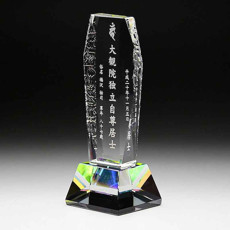 商品説明 概要 地球環境にやさしいクリスタルガラス製のお位牌です。 ガラス背面の波紋加工にガラスが虹色に変化するホログラム加工が美しく光ります。 仕様 ●寸法 高さ: 18cm、幅: 7cm、奥行: 6cm ●材質 エコロジークリスタルグラス ●戒名 サンドブラスト加工により文字彫刻を施します。書体は、楷書体(写真のもの)、行書体、明朝体よりお選びいただけます。 備考 ※上記寸法は代表値であり、多少の誤差が出ることがあります。予めご了承ください。 ※位牌には宗派はございません。仏壇に合わせお好みのものをお選びください。 ※戒名・没年月日等の内容は備考欄に箇条書きにてご記入ください。仮位牌の写真をメールでお送り頂いても構いません。 ※写真のレイアウトに限らず、どのようなレイアウトにも対応できます。店長イチ押し商品!コンパクトサイズの仏壇をお探しの方にお薦めします。 「ケヤキ調10号」→商品ページ 「つかさワイン」→商品ページ