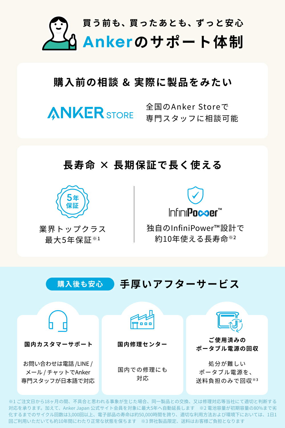 コンパクトでも、家族サイズ。世界最小※クラスの大容量ポータブル電源 2000Wh帯で世界最小※1サイズを実現。変換効率を改善し、一般的な2000Wh帯より最大約3倍※2長く家電を使える。Anker独自の急速充電技術HyperFlash 3人以上の家族にも安心の大容量 いつもの家電をより長く複数台同時に動かせる 2048Whの大容量、家庭用のコンセントよりも大きい定格2000Wの高出力なため、停電時に3~5人で使用しても約2~3日間※の電力供給が可能です。※1日あたり700Wを使用した場合の目安。 前モデルよりも、最大約2倍※長く家電が使える BMSのアルゴリズム最適化により、DCからACへの変換ロスを削減することで、高い電力変換効率を実現しました。これにより前モデルよりも長く家電を動かすことが可能です。 ※LEDライトの使用時間で比較した場合 ※Anker 767 Portable Power Station (GaNPrime PowerHouse 2048Wh)との比較。充電回数は各機器の定格消費電力に基づく計算上の数値 (Anker調べ) ※ご使用の機器の消費電力や使用状況により変動します 2000Wh帯で世界最小※1サイズ & ダブルグリップで持ち運びがしやすい 前モデル※2からサイズは約50%、重さは約40%軽量化しコンパクトに。加えて両側面にハンドルを搭載し、両手で重さを分散することができるため、とっさの避難時にも持ち運びやすくなりました。※1 容量2000Wh帯のリン酸鉄リチウムイオン電池搭載モデルにおいて。ハンドル部分を除く体積計算に基づく (2025年9月時点 Anker調べ)※2 Anker 767 Portable Power Station (GaNPrime PowerHouse 2048Wh) との比較 10年以上※使える長寿命設計 電池寿命が長く安全性の高いリン酸鉄リチウムイオン電池を採用。独自技術による電子部品の長寿命化も実現し、10年以上※ご使用いただけます。※電池容量が初期容量の80%まで劣化するまでのサイクル回数は4,000回以上、電子部品の寿命は50,000時間を誇り、適切な利用方法および環境下においては、1日1回ご利用いただいても約10年以上に渡り正常な状態を保ちます 世界最速※、100%満充電まで99分 Anker独自の急速充電技術HyperFlashにより、100%充電までわずか99分。急な災害で電気が必要になっても、充電の不安がなくなります。 ※容量2000Wh帯における重量20kg未満のモデルにおいて。 AC充電のみでの充電時間に基づく。外気温や使用環境により充電時間は異なる場合があります(2025年9月時点 Anker調べ) UPS機能を搭載し、コンセントに繋いだままで保管可能 停電時には10ミリ秒で切り替わるUPS機能を搭載し、バックアップ電源としてご使用いただけます。Anker独自の過充電保護機能により、コンセントに繋いだままでの保管も可能です。 人数や日数に合わせた拡張バッテリーで長期間の備えも Anker Solix BP2000 拡張バッテリーに接続することで、容量を2048Whから4096Whに倍増できます。※Anker Solix BP2000 拡張バッテリーは単体での使用はできません 選べる充電方法 ACコンセントからの急速充電はもちろん、ソーラーパネルやシガーソケットからも充電が可能です。 アプリからの操作にも対応 Ankerアプリから充電・給電状況の確認や、遠隔での入力スピード操作が可能。更に電気料金が安い時間帯に充電し、高い時間帯に放電して電気を使う、TOU機能を搭載し電気代の節約・最適化ができます。※アプリの言語は日本語になります ご注意 ・製品の仕様およびパッケージは予告なく変更されることがありますので、予めご了承ください。 Anker Solix C2000 Gen 2 Portable Power Station ダークグレー 製品の仕様・注意点はこちら Anker Solix BP2000 拡張バッテリー (2048Wh) 製品の仕様・注意点はこちら Ankerグループのすべての対象製品(モバイルバッテリー・急速充電器・イヤホン等)は、PSEマークの取得に必要な技術基準に適合しております。 届出事業者名:アンカー・ジャパン株式会社 PSマークの種類:PSE Anker Ankerは、”充電”のグローバル・リーディングブランド。 最新のテクノロジーを採用しながら、納得の価格と安心のサービスで、高品質のスマートデバイス周辺機器を世界100ヶ国以上で展開し充電関連製品でトップの販売実績を誇る「世界No.1モバイル充電ブランド」※です。 Ankerの大容量ポータブル電源シリーズの特徴は「長寿命」。充放電サイクル3000回以上を誇るリン酸鉄リチウムイオン電池に加え、Anker独自の【InfiniPower設計】を採用。内部電子部品の発熱抑制、堅牢な製品フレームの採用、そして発熱を監視 / 管理するバッテリー管理システムの導入等により、ポータブル電源製品全体の長寿命化を実現しました。 長寿命の大容量ポータブル電源は、アウトドアやキャンプ、車中泊、防災、停電対策などの利用におすすめです。 主な取扱製品:ポータブル電源、ソーラーパネル、ポータブル電源用拡張バッテリー、無停電電源装置、ポータブル冷蔵庫 ※(2021年小売販売額における) 出典:ユーロモニターインターナショナル 2021年の小売販売額ベース、2022年10月に実施された調査に基づく。 モバイル充電ブランドは、小売売上の75%以上を携帯電話充電器製品が占めるブラン