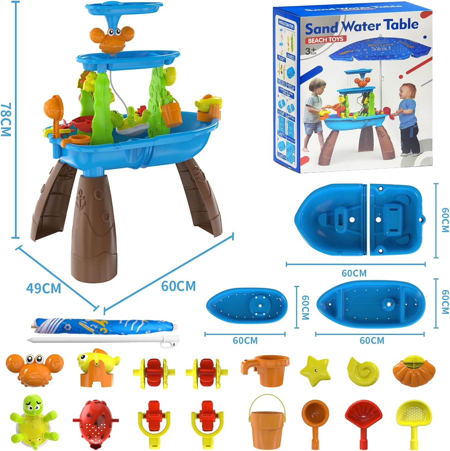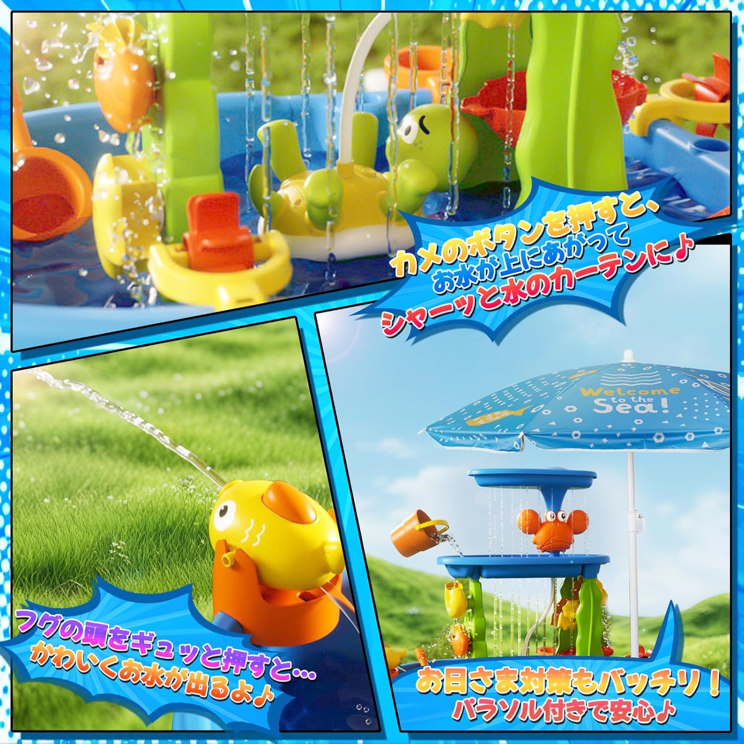2025年 水遊び ウォーターテーブル 自動給水 日よけパラソル付 カメポンプ&フグ噴水 組立簡単 豊富アクセサリー付 夏 室外 ビーチ 水のおもちゃ 子供向け ギフト 親子