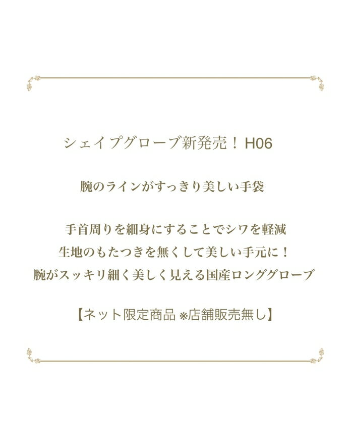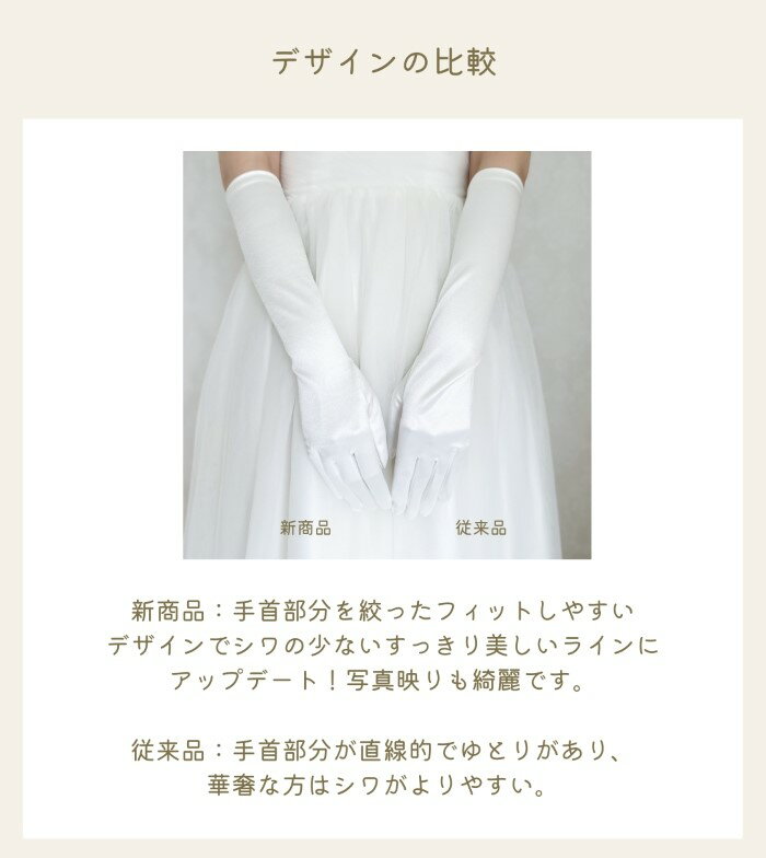 その他の商品はこちら♪ ティアラ ヘッドドレス カチューシャ ネックレスセット ティアラ+ネックレス(3点セット) イヤリング・ピアス単品 ウェディングベール ウェディンググローブ ブーケ/花冠 パニエ/リボントレーン ウェディングボレロ HOTキーワード 送料無料 ウエディンググローブ グローブ 海外ウエディング パーティー 結婚式 挙式小物 ショート サテンロング 花嫁 手袋 オーガンジー レース 刺繍 ホワイト オフホワイト ウエディング グローブ ショート結婚式ウェディングドレス 二次会ドレス パーティー向け オーガンジーショートグローブ ウェディンググローブ ブライダル花嫁 ウェディンググローブ 花嫁 総レースショートグローブ 手袋ホワイト オフホワイト 婚礼 キュート 可愛い 上品 エレガント おしゃれ シック ロンググローブ ミディアム ブライダル 清楚 花嫁 新婦 サテン ビーズ パール メッシュ 結婚式 披露宴 2次会 パーティ お披露目 手袋 フォーマルWEDDING GLOVE 花嫁の手元を優雅に美しく魅せるグローブ 2024年10月28日(月)グローブランキング第1位 シェイプグローブ新発売!H06 手首周りを細身にすることでシワを軽減 生地のもたつきを無くして美しい手元に! 腕がスッキリ細く美しく見える国産ロンググローブ 【ネット限定商品 ※店舗販売無し】 DESING 柔らかで光沢感があり、手首のラインに沿ったデザインで腕をより細く見せてくれるシェイプグローブ。従来品は、手首部分にシワがよりやすく、手元のぶかぶかが気になったり、ずり落ちたりするという問題がありました。 今回新登場のシェイプグローブは手首周りを絞ったデザインにすることで、シワのないすっきりとした美しいラインを実現。伸縮性があるので、着け心地も抜群。上質な生地が綺麗にフィットして腕を細く長く見せてくれます。 サイズはS,M,Lの3サイズ、長さは40cm、45cm、50cmの3種類をご用意しております、生地はA・B2種類をご用意しております。※それぞれ価格が異なりますのでご注文時に必ずご確認ください 【A スパンシェイプ】柔らかく光沢感と厚みのある素材、特殊加工で従来品より傷がつきにくくなっています。 【B サテンシェイプ】艶やかで伸縮性のあるストレッチ素材でフィット感が抜群です。 ドレスのデザインやコーディネートによって雰囲気が変わりますので着用されるドレスとのバランスが重要です♡標準的なサイズの方は、Mサイズのどんなドレスにも合わせやすい長さ40cmがおすすめです。衛生上返品・交換は承っておりませんので、事前にご自身のサイズを正確にお測りいただくようお願い致します。 【サイズの選び方】 ・手長(手首から中指先端までの長さ)を測る ・手囲い(親指は入れず手のひらをぐるりと一周した長さ)を測る 実際に測った手の大きさと同じくらいのサイズをお選びになることをおすすめします。 あまりゆとりが多くならないようにご注意下さい。 Sサイズ:手首や指が細く華奢な方 Mサイズ:標準的なサイズの方 Lサイズ:手のひらが大きめの方 【長さについて】 40cm:可愛らしくスッキリと見せるなら肘下丈がおすすめ。拳式使える人気の長さです。 45cm:丁度肘あたりまでの長さで、ドレスの袖の有無にかかわらずどちらでも合わせられます。 50cm:肘上5~10cmほどまでかかる王道バランス。フォーマルな雰囲気なので袖のないビスチェドレスやクラシカルなデザインのドレスによく合います。 QUALITY 丁寧な縫製で安心の国産アイテムです。光沢感のある上質な日本製のスパンテックスサテンを使用。 特殊加工により従来のサテン生地よりも傷つきにくくなっています。指輪交換時などもスムーズに着脱できます。