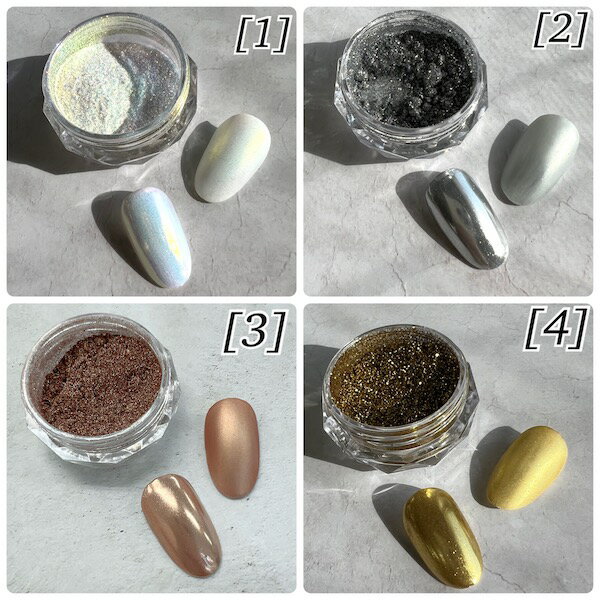 6カラーアイシャドーミラーパウダー 4カラーアイシャドーミラーパウダー ☆スモーキーミラーパウダー☆ ☆2カラーアイシャドーミラーパウダー☆ 新商品!!☆オーロラアイシャドーミラーパウダー☆ 新商品!!☆ノンワイプトップジェル☆ 新商品!!☆ノンワイプマットトップジェル☆ ミラーパウダー商品詳細 容量 約0.4g 使用方法 1.ベースのカラージェルを塗布して硬化 ※ミラーパウダーの色をはっきり出したい場合は白がおすすめです。 2.ノンワイプトップジェルを塗布して硬化 ※使用するジェルとライトにより硬化時間が異なります。 ※未硬化があったり、硬化しすぎると綺麗につきません。 3.アイシャドーチップ等にミラーパウダーを少量取り、 表面に擦りつけます。 4.トップジェルを塗布して硬化 注意事項 ※16番は2024/9/25よりリニューアルしました。 ※14番は2024/5/3よりリニューアルしました(ユニコーンパウダーが入っています) ※3番は2023/1/18よりリニューアルしました。。 ※21番のみ容器が異なります。 ※パウダーにより質や重さが異なるので、同じグラム数でも見た目の量に違いがございます。 ※ご使用のノンワイプトップジェルやライトにより、ミラーパウダーが定着する硬化時間が異なります。 ライトのワット数が高いと定着しにくい場合がございます。 ミラーパウダーが定着しにくい場合は硬化時間を短くするなどの調整をしてください。 上記の理由での交換返品は致しかねますので予めご了承ください。