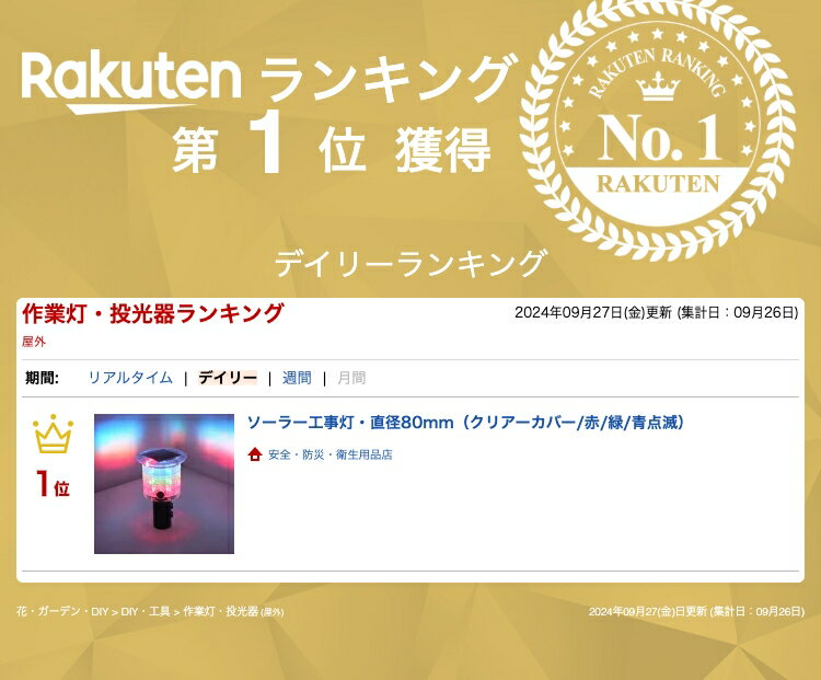 商品情報 サイズ ●上部直径100mm×中部直径80mm×下部直径38mm×高さ160mm材質 ●本体/ポリカボネート/ABS樹脂 その他 ●超高輝度LED数:赤6個、緑6個、青6個●視認距離:夜間約800m●明暗センサー付(暗くなると点灯します。)関連商品ソーラー工事灯(透明カバー/赤青同時点滅)工事灯 点滅灯 警告灯 ソー...ソーラー式セフティーフラッシュ(赤点滅)工事灯 点滅灯 警告灯 注意灯...上下点滅ソーラー工事灯・直径80mm(クリアーカバー/黄点滅/赤高輝度...1,430円1,980円1,650円同期点滅ソーラーLED保安灯・幅75mm(点滅赤/緑・マーカーライト)...ソーラー工事灯・幅83mm(赤回転点滅/コーン用ジョイント付)...ソーラー工事灯・幅83mm(赤点滅/コーン用ジョイント付) ソーラー工...5,874円1,980円1,760円ソーラー工事灯・幅65mm(赤/緑・フラッシュ交互点滅)工事灯 点滅灯...ソーラー工事灯・直径74mm(赤/緑点滅)...ソーラー工事灯・直径74mm(赤/緑点滅)...1,540円1,320円1,320円ソーラー式工事灯・幅90mm(赤点滅)ソーラー式工事灯・幅90mm(赤点滅)ソーラー式セフティーフラッシュ(赤点滅)工事灯 点滅灯 警告灯 注意灯...1,210円1,210円1,870円ソーラー工事灯・直径80mm(クリアーカバー/赤/緑/青点滅) 小型でも視認性に優れています、赤、青、緑が点滅、360°視認が可能な商品です。 【在庫がある場合】1日〜2営業日以内に発送します。 1