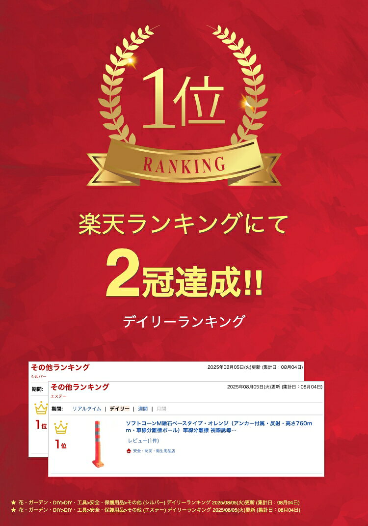 商品情報サイズ底部幅260mm×奥行160mm×高さ760mm×上部直径75mm×下部直径95mm材質本体/ポリウレタン製・台座/PVC製(抗張力や耐摩耗性、耐油性に優れている商品です。)その他アスファルトかコンクリート、どちらで使用かをお選びください。関連商品ソフトコーンM(アンカー付属・反射・高さ760mm・視線誘導標ポール)...ソフトコーンM・グリーン(アンカー付属・反射・高さ760mm・視線誘導...ソフトコーンM/ベースなし・オレンジ(アンカー埋込式・反射・高さ800...7,810円7,810円10,802円ソフトコーンM(アンカー付属・反射・高さ1000mm・視線誘導標ポール...鉄板スタンド・オレンジ白・800mm(白反射/強力マグネット・フック付...ソフトコーンM/10本セット(アンカー付属・反射・高さ760mm・視線...10,802円3,300円77,000円減速帯・タイプ6・長さ1m×奥行100mm×高さ15mm(黄色部分1個...ソフトコーンM縁石ベースタイプ・オレンジ(アンカー付属・反射・高さ10...ソフトコーンM/ベースなし・オレンジ(アンカー埋込式・反射・高さ650...7,920円10,802円9,801円視線誘導標ポール・高さ650mm・オレンジ白(白高輝度反射シート付・兼...まる見えコーン・クリア/緑高輝度反射(PVC/高さ714mm)...ソフトコーンM接着式(接着式アダプター付属・反射・高さ760mm・車線...9,900円6,930円10,604円ソフトコーンM縁石ベースタイプ(アンカー付属・反射・高さ760mm・車線分離標ポール) 柔軟性に優れるポリウレタン製なので駐車場内で車両の衝突などにも強い構造です。壊れやすい支柱部のみの交換も可能。160mm×260mmのベースなので、縁石上部などに最適な商品です。 1