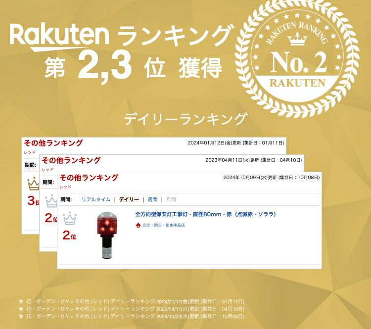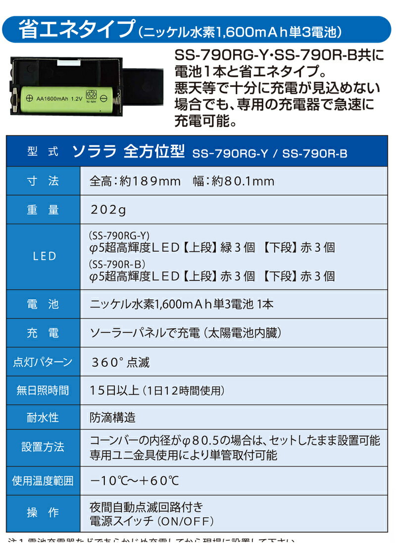 商品情報サイズ全体高189mm/点灯部直径80.1mm/下部筒径約38mm材質耐強化ポリカーボネート重量202gLED数超高輝度LED6個(赤6個)電源ニッケル水素1600mAh単3電池×1個点滅方式360°点滅充電太陽電池内蔵無日照約15日以上使用可能(常温で約12時間使用時)その他●防滴構造●カットコーン差込可能●専用金具使用により単管取付可能●夜間自動点滅装置付●電池交換可能送料の件北海道、沖縄県、離島は別途送料が必要となっております。関連商品非常用回転灯・青色(12V用・コード長約2.0m/底面マグネット付)...電池式閃光灯・直径130mm(LED5灯/10灯切替式・赤点滅)...ソーラーLED保安灯・幅55mm・赤(点滅赤・マーカーライト)...1,947円880円2,640円LED車載回転灯・緑色(12V/24V兼用・強力マグネット付)回転灯 ...電池式LEDフラッシュ回転灯・直径90mm(LED6個・赤青回転点滅)...工事灯取付バイス・黄色(外径52mm・単管・工事看板等取付金具) ...11,440円550円270円ソーラー工事灯・直径87mm(回転赤点滅/バイス付)工事灯 点滅灯 単...LEDフラッシャーベスト・赤発光・会社名等記入タグ付(紺黄・高輝度反射...LEDフラッシャーベスト・赤発光・会社名等記入タグ付(橙黄・高輝度反射...2,640円1,870円1,870円LEDフラッシャーベスト・赤発光・会社名等記入タグ付(黄黄・高輝度反射...ソーラー工事灯・幅83mm(赤カバー/赤回転点滅/バイス付)...ソーラー式小型LED表示機・410mm×370mm(ソーラーONE)...1,870円2,585円275,000円全方向型保安灯工事灯・直径80mm・赤(点滅赤・ソララ) 六角形の発光部にレンズを付け大きく明るく見える。無日照でも15日以上可能。コーンバーの内径が直径80.5mm以下のの場合は、セットしたまま設置可能な商品です。 1