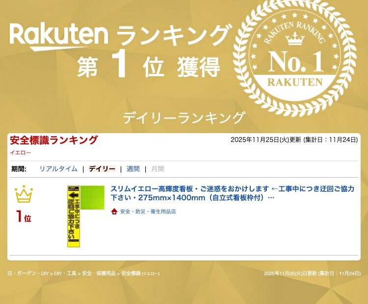 商品情報サイズ(約)●板サイズ:幅275mm×縦1,400mm●枠付サイズ:幅280mm×高さ1,550mm材質スチール重量約4kg配送料の件【大型商品のため】同種類の看板で1台〜3台の場合は送料が1,430円(税込)必要となります。(北海道、沖縄県、離島などは別途送料が必要となります。)同種類の看板で4台単位でのご注文で送料無料。(北海道、沖縄県、離島などは別途送料が必要となります。)関連商品スリムイエロー高輝度看板・ご迷惑をおかけします →工事中につき迂回ご協...スリムイエロー高輝度看板・ご迷惑をおかけします 工事中この先片側交互通...スリムイエロー高輝度看板・工事予告 ○月○日から○月○日まで 大変ご迷...4,840円4,840円4,840円スリムイエロー高輝度看板・ご迷惑をおかけします 工事用車両出入口・27...スリムイエロー高輝度看板・ご迷惑をおかけします 50m先工事中・275...スリムイエロー高輝度看板・ご迷惑をおかけします この先片側交互通行・2...4,840円4,840円4,840円スリムイエロー高輝度看板・工事中・275mm×1400mm(自立式看板...スリムイエロー高輝度看板・ご迷惑をおかけします 停止位置・275mm×...スリムイエロー高輝度看板・ご迷惑をおかけします 工事中につきご協力をお...4,840円4,840円4,840円スリムイエロー高輝度看板・作業中・275mm×1400mm(自立式看板...スリムイエロー高輝度看板・ご迷惑をおかけします この先段差あり・275...スリムイエロー高輝度看板・ご迷惑をおかけします 作業中につきご協力をお...4,840円4,840円4,840円スリムイエロー高輝度看板・ご迷惑をおかけします ←工事中につき迂回ご協力下さい・275mm×1400mm(自立式看板枠付) 下段文字入れ無料。普通枠又はフラット枠かをお選び頂けます。エイブリィ社製の反射材で、褪色しにくく、自立式の枠が付いた商品になります。 1